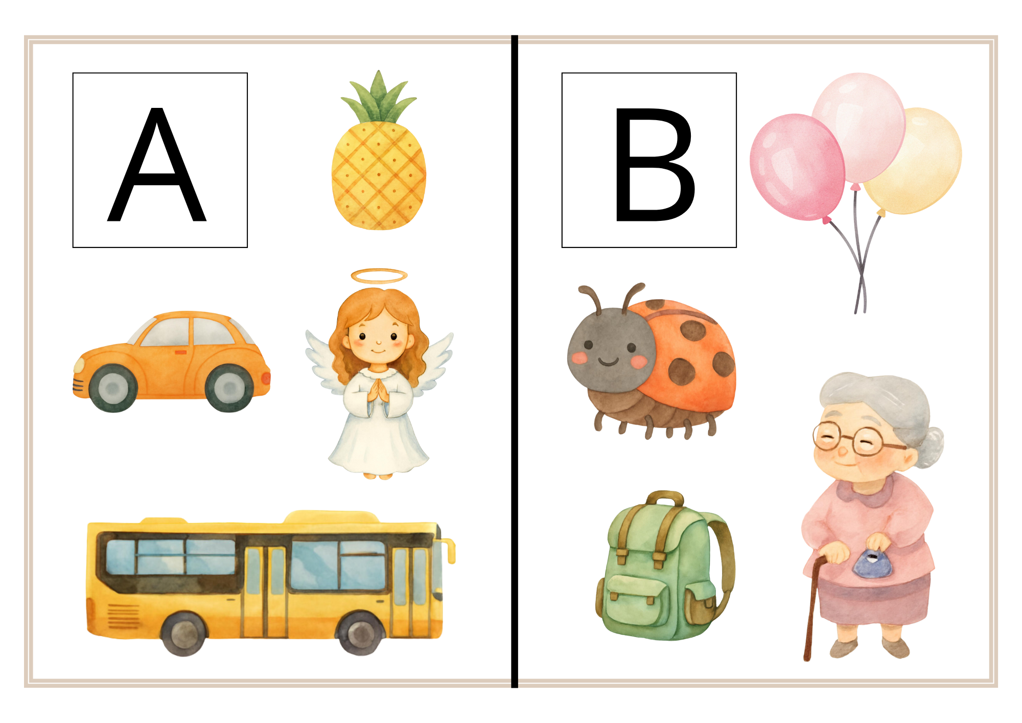 Každá stránka představuje dvě písmena s obrázky, které dětem pomáhají pochopit počáteční hlásku slova.