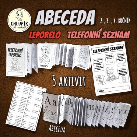 Součástí je telefonní LEPORELO – sada karet se jmény 34 dětí, seřazených podle abecedy. U každého jména je obrázek dítěte, který si děti mohou vybarvit. Na druhé straně leporela najdete abecedu se čtyřmi podobami písma doplněnou obrázky pro lepší zapamatování.