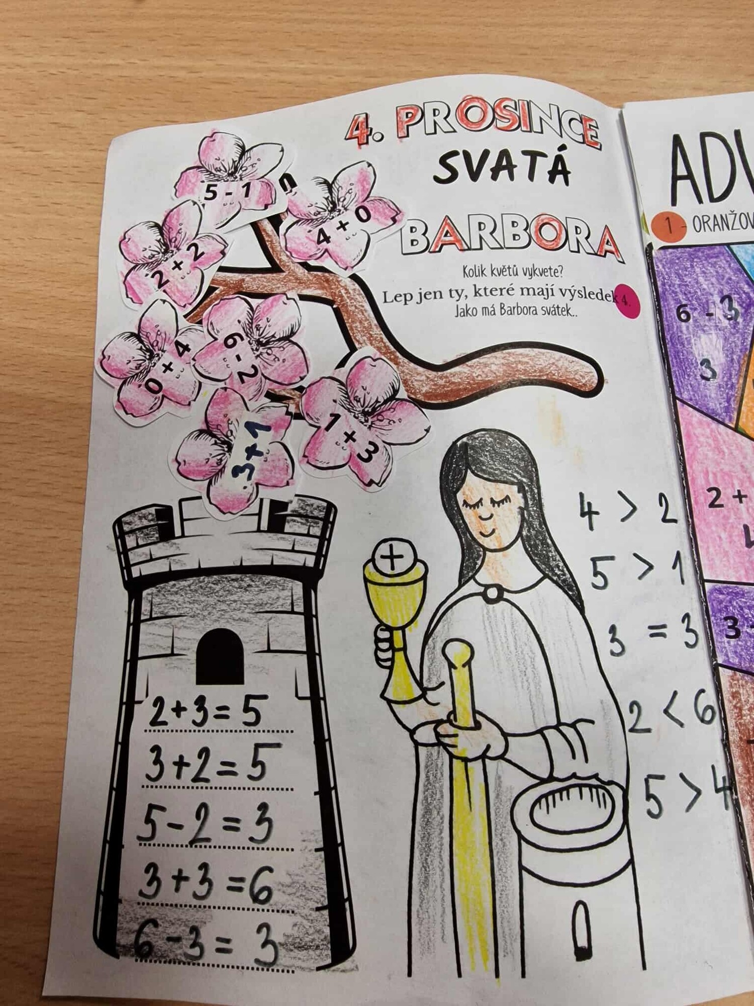 jako má Barbora svátek 4. Ty příklady, které se nerovnají 4 píší děti do věže. Vedle Barbory porovnají čísla.