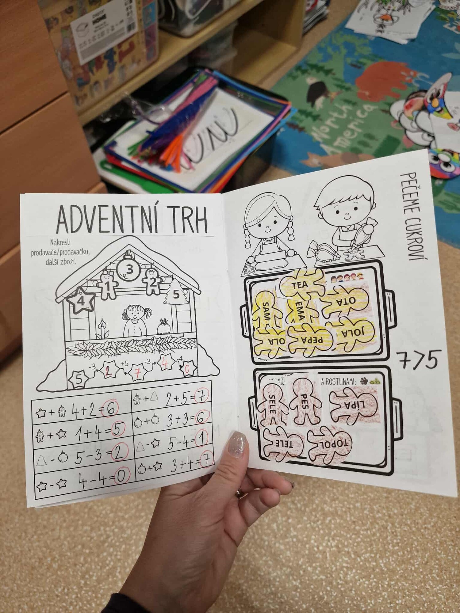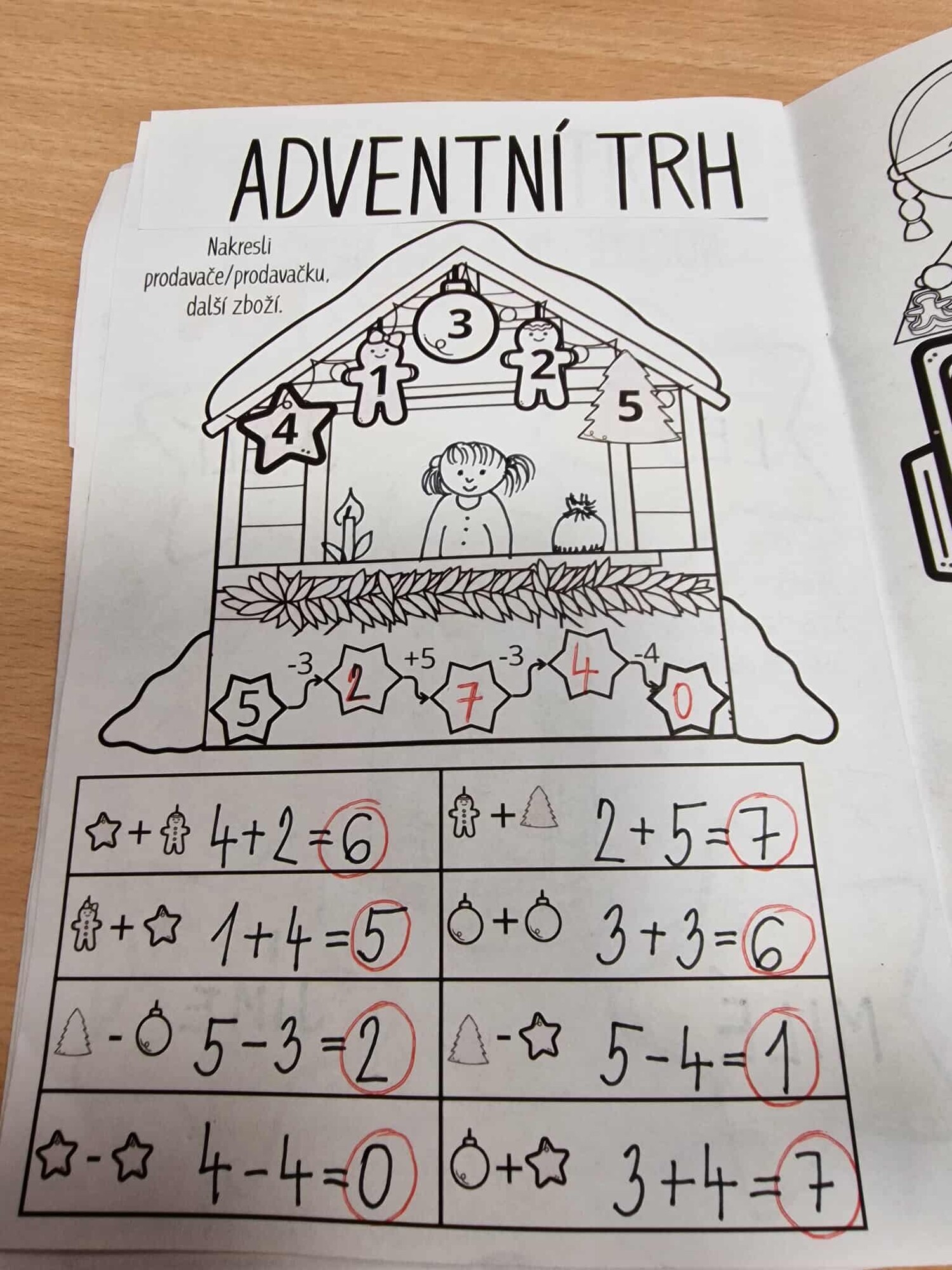 ADVENTNÍ TRH – MATEMATIKA – děti si místo symbolů dosadí čísla podle čísel ve stánku a vypočítají příklady,