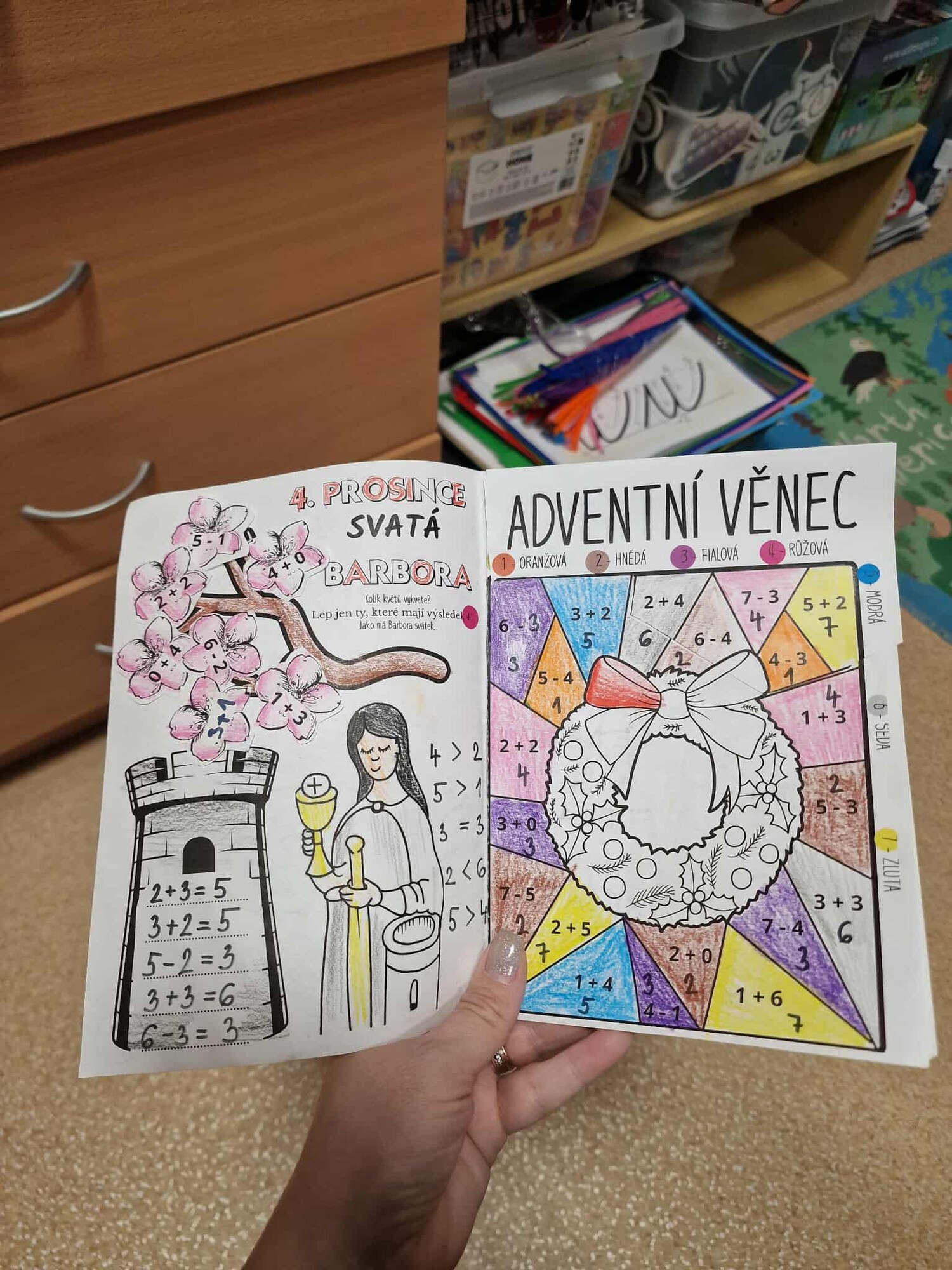 SVATÁ BARBORA – MATEMATIKA + – DO 6: Děti stříhají a lepí květy na větvičku. Lepí jen ty, co mají výsledek 4 –