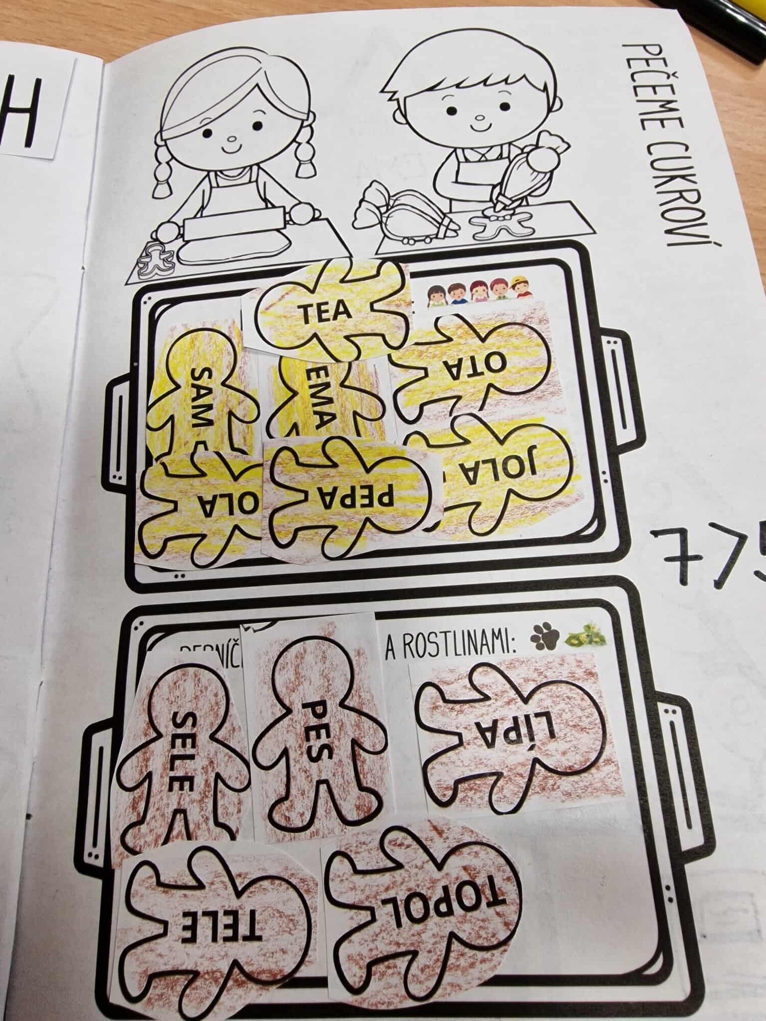 PEČENÍ CUKROVÍ – ČTENÍ S POROZUMĚNÍM – děti vystřihnou a vykreslí perníčky, třídí je do plechů: NAHORU