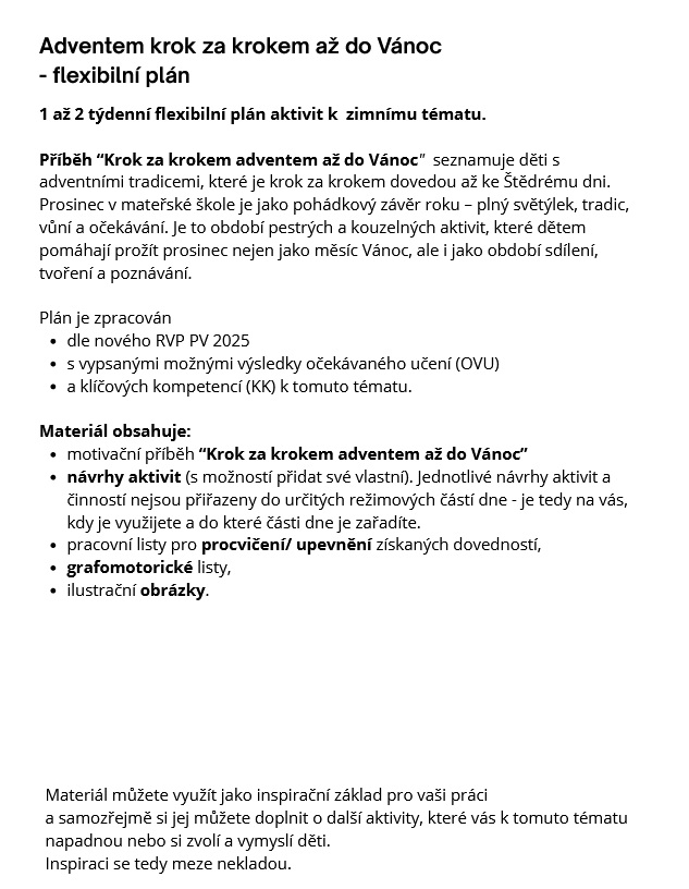 Příběh “Krok za krokem adventem až do Vánoc" seznamuje děti s adventními tradicemi, které je krok za krokem dovedou až ke Štědrému dni. Prosinec v mateřské škole je jako pohádkový závěr roku – plný světýlek, tradic, vůní a očekávání. Je to období pestrých a kouzelných aktivit, které dětem pomáhají prožít prosinec nejen jako měsíc Vánoc, ale i jako období sdílení, tvoření a poznávání.