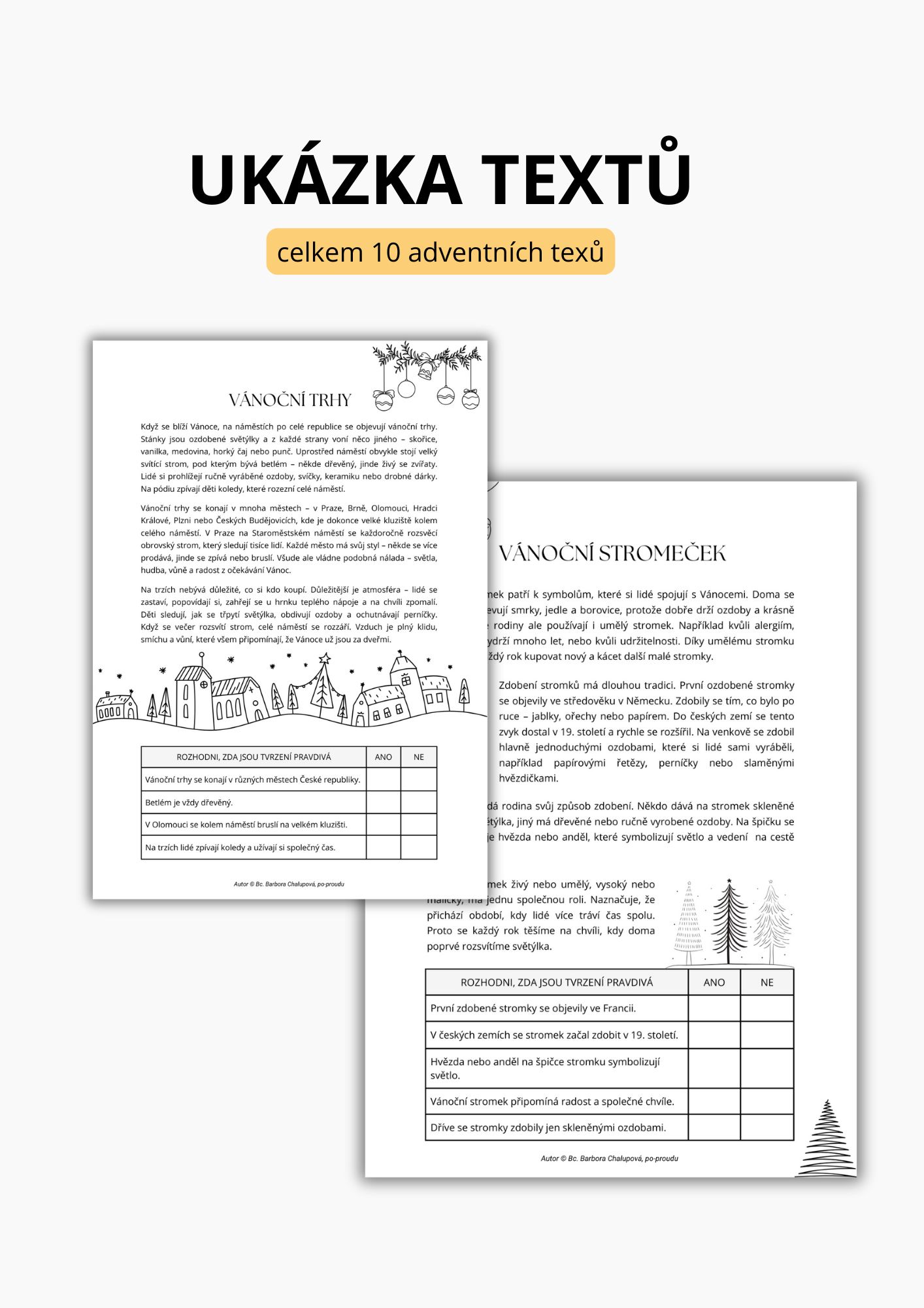 Praktický materiál, který vám pomůže zvládnout prosincové období bez zdlouhavé přípravy. Najdete v něm 10 krátkých textů k nejčastějším adventním tématům a k nim sadu úkolů ANO/NE, díky nimž rychle ověříte porozumění. 🌲