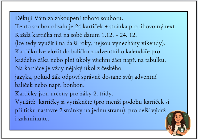 Tento soubor obsahuje 24 kartiček + stránka pro libovolný text. Každá kartička má na sobě datum 1.12. - 24. 12. (lze tedy využít i na další roky, nejsou vynechány víkendy).