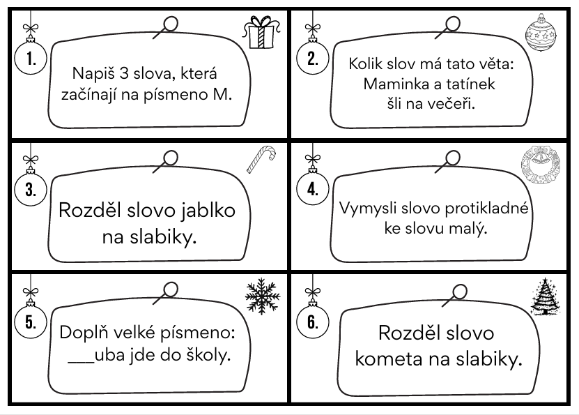 Kartičku lze vložit do balíčku z adventního kalendáře pro každého žáka nebo plní úkoly všichni žáci např. na tabulku.