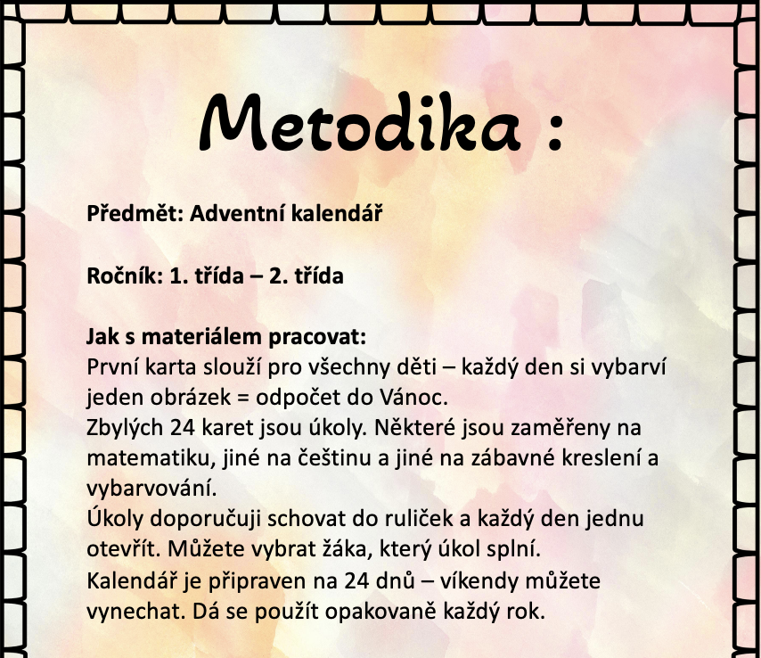 Úkoly je možné dětem natisknout. Případně vybrat vždy jednoho zástupce, který úkol za třídu splní. Zbytek vybarvuje pouze adventní omalovánku.