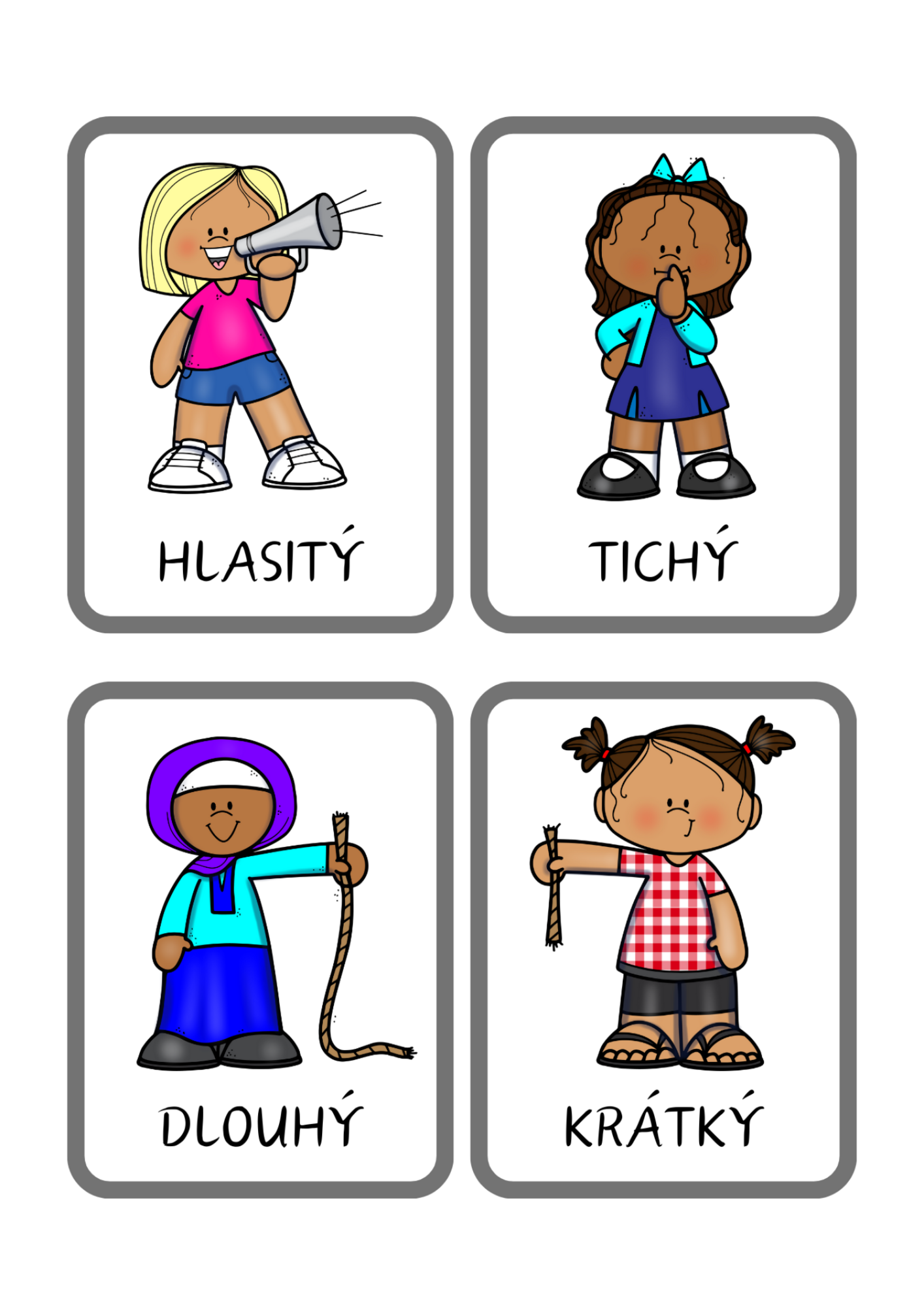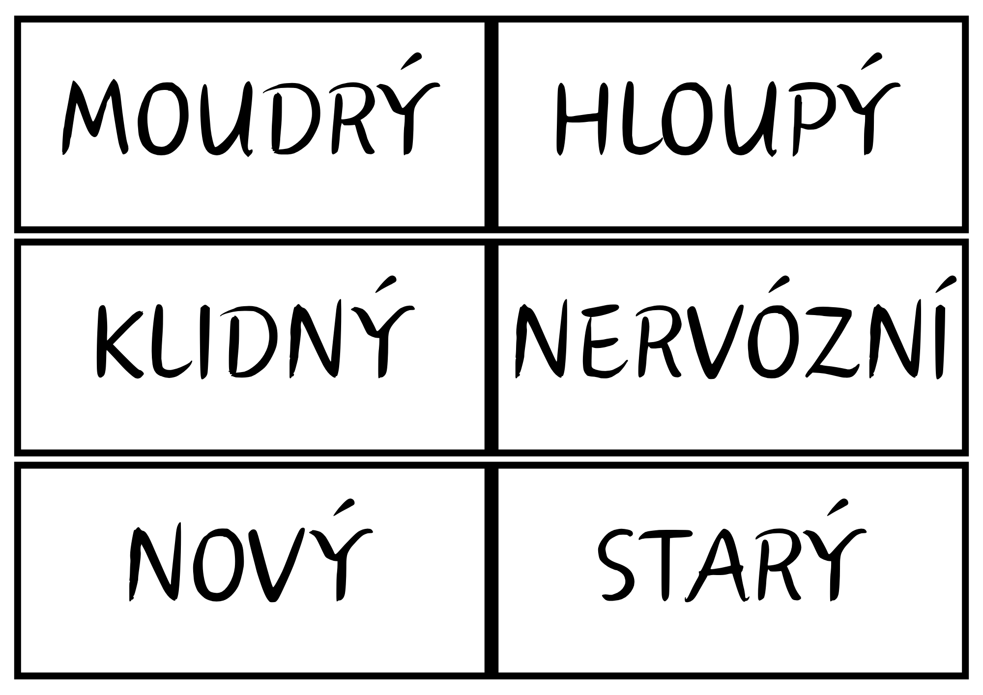 - Obrázkové kartičky – 56 ilustrovaných kartiček pro vizuální rozpoznávání antonym.
