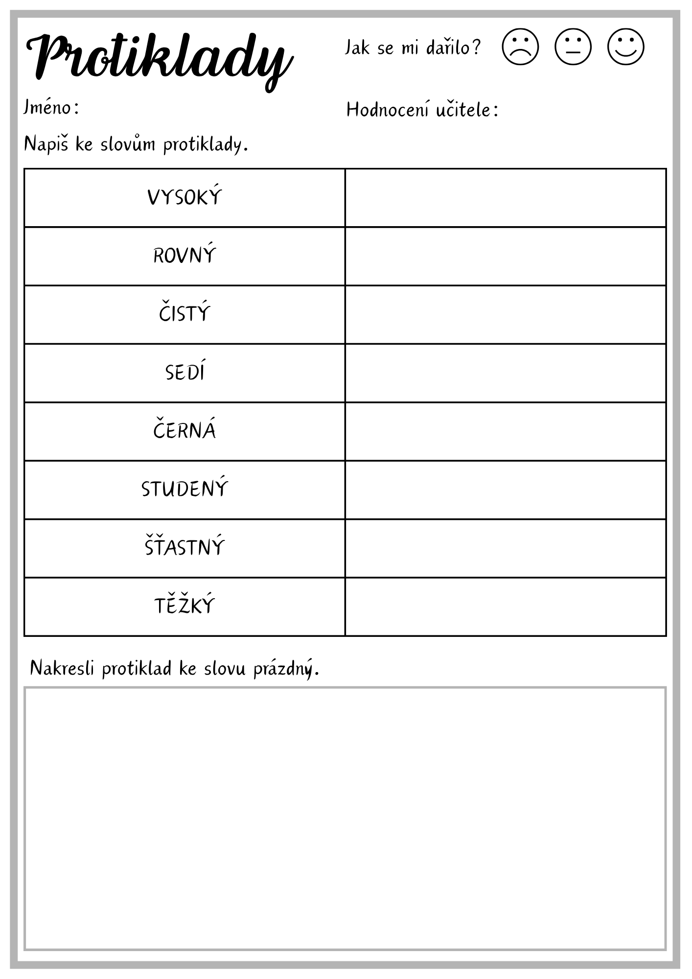 - Pracovní listy – doplňování, psaní a určování protikladů, včetně řešení.