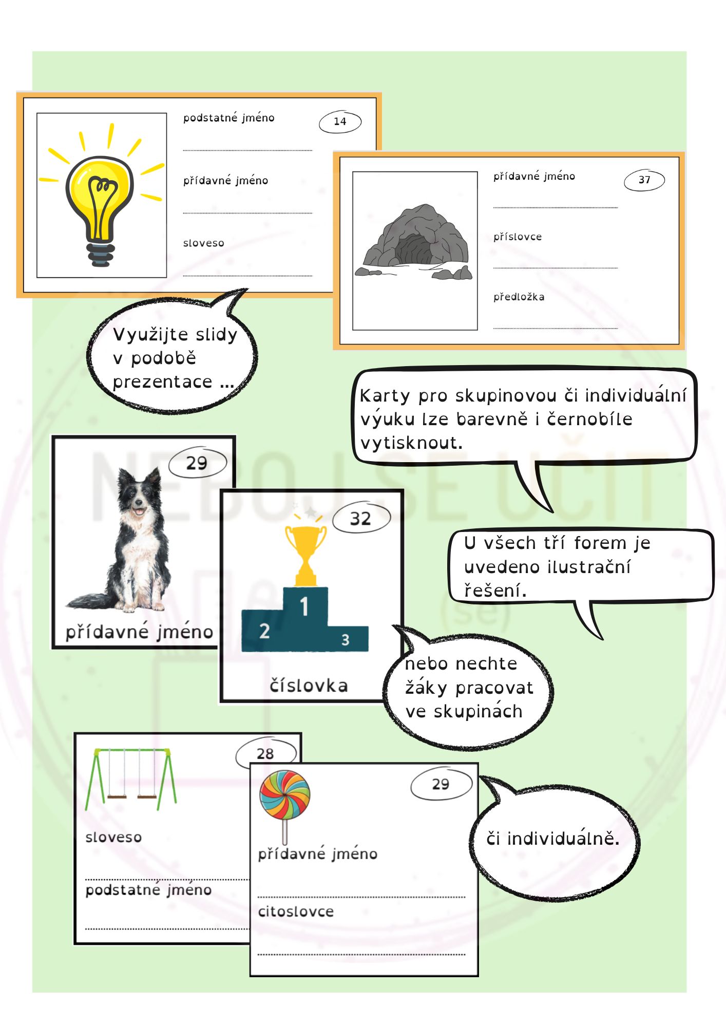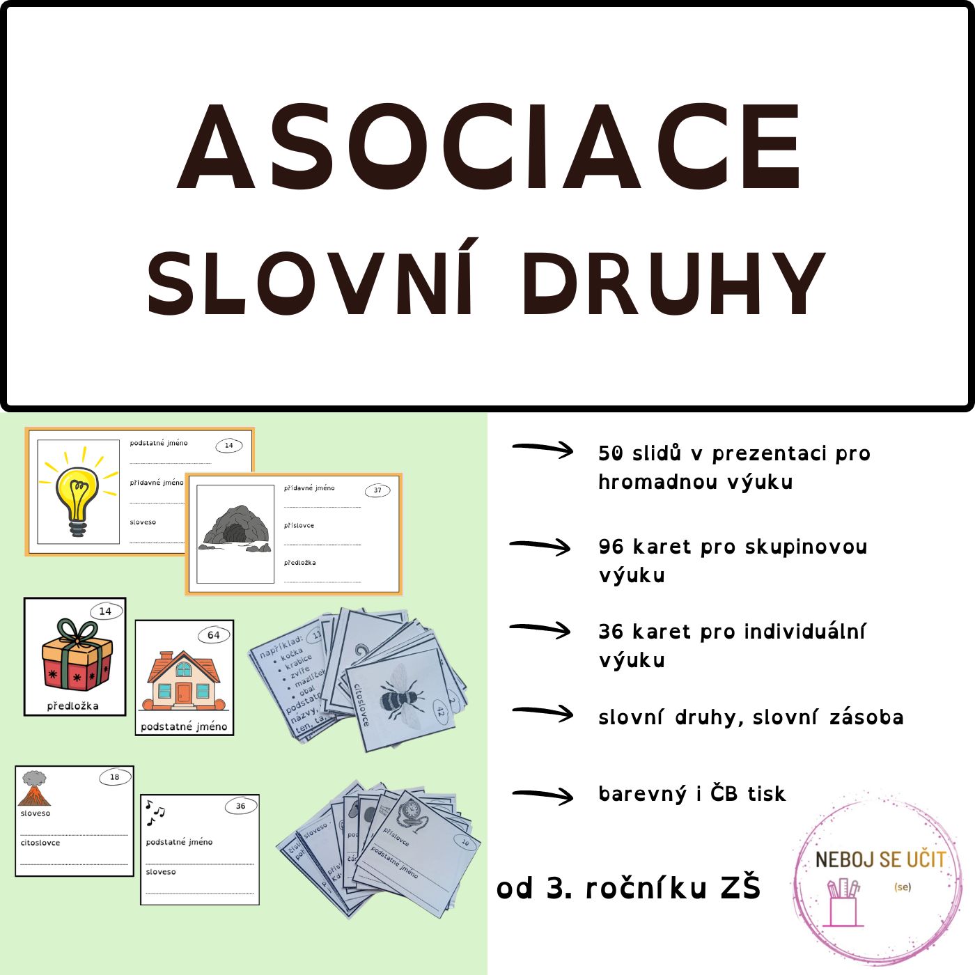Materiál Asociace - slovní druhy je zhotoven na bázi didaktické hry a se skládá ze tří částí. První z nich je zpracovaná v podobě prezentace s 50 slidy, další zahrnuje 96 karet pro skupinovou práci a poslední částí je 36 karet pro individuální činnost. Všechna zpracování si však zachovávají stejnou podstatu práce, a to k uvedenému obrázku a slovnímu druhu napsat vhodná slova. Aktivita směřuje k rozvoji slovní zásoby, orientaci z hlediska slovnědruhové klasifikace a divergentnímu myšlení. Všechny varianty lze využívat v předmětu český jazyk od 3. ročníku ZŠ. Doporučuji barevně vytisknout a karty zalaminovat. Součástí variant jsou také šablony k vytvoření dalších karet či slidů.