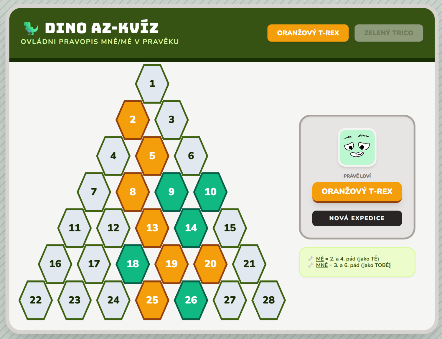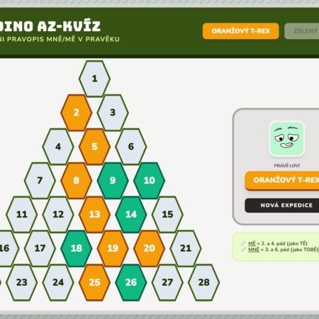 Tato aplikace je interaktivní vzdělávací hra pro dva hráče, inspirovaná populárním televizním formátem AZ-kvíz, ale zasazená do atraktivního prostředí dinosauřího pravěku. Procvičování pravopisu mě/mně.