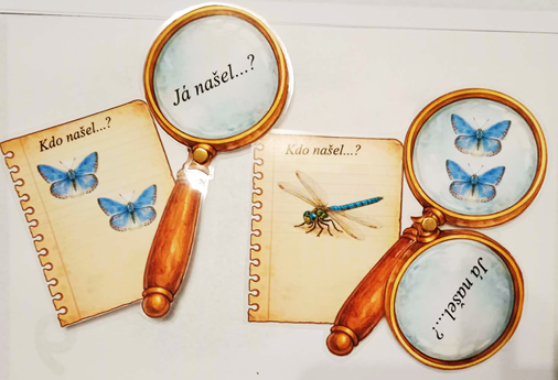 - Jeden vybraný žák se začne tím, že nahlédne do své lupy „Já našel dva motýli se žlutými křídly, Horní křídla mají na sobě i oranžovou skvrnu a na každém křidélku je jeden oranžový puntík (žluťásek). à a ptá se na živočich ze zápisníku - Kdo našel čtyři slunéčka sedmitečná?