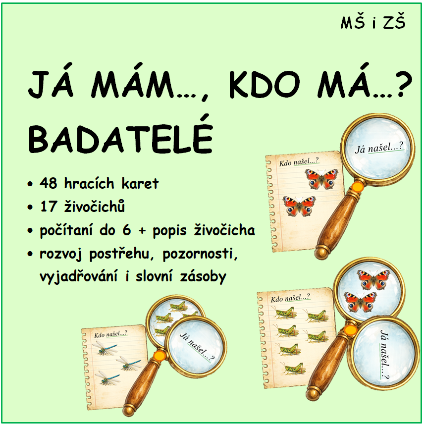 Materiál obsahuje 48 kartiček s bezobratlými živočichy, které malí badatelé hledají. Protože se živočichové opakují nebo zde máme zobrazeno několik motýlů je důležité, aby děti řekly počet (do 6) a popsali živočicha, kterého hledají. Tato hra tak rozvíjí matematickou pregramatnost, slovní zásobu, schopnost se vyjadřovat a pozornost.