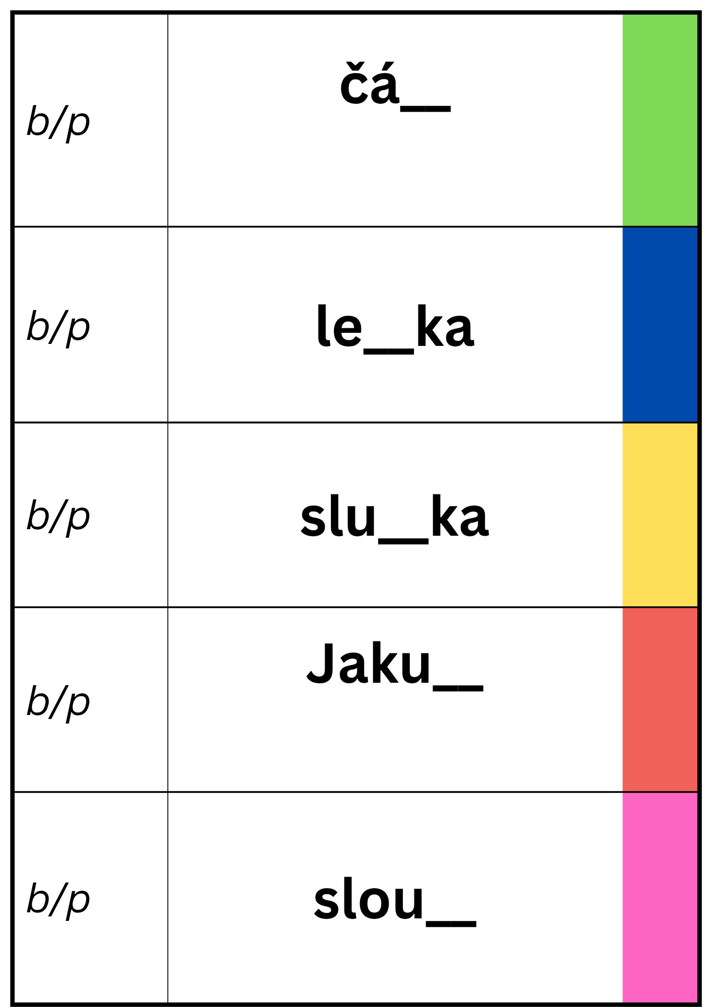 - Každý žák dostane barevnou tabulku do které bude zaznamenávat mazacím fixem párovou souhlásku.