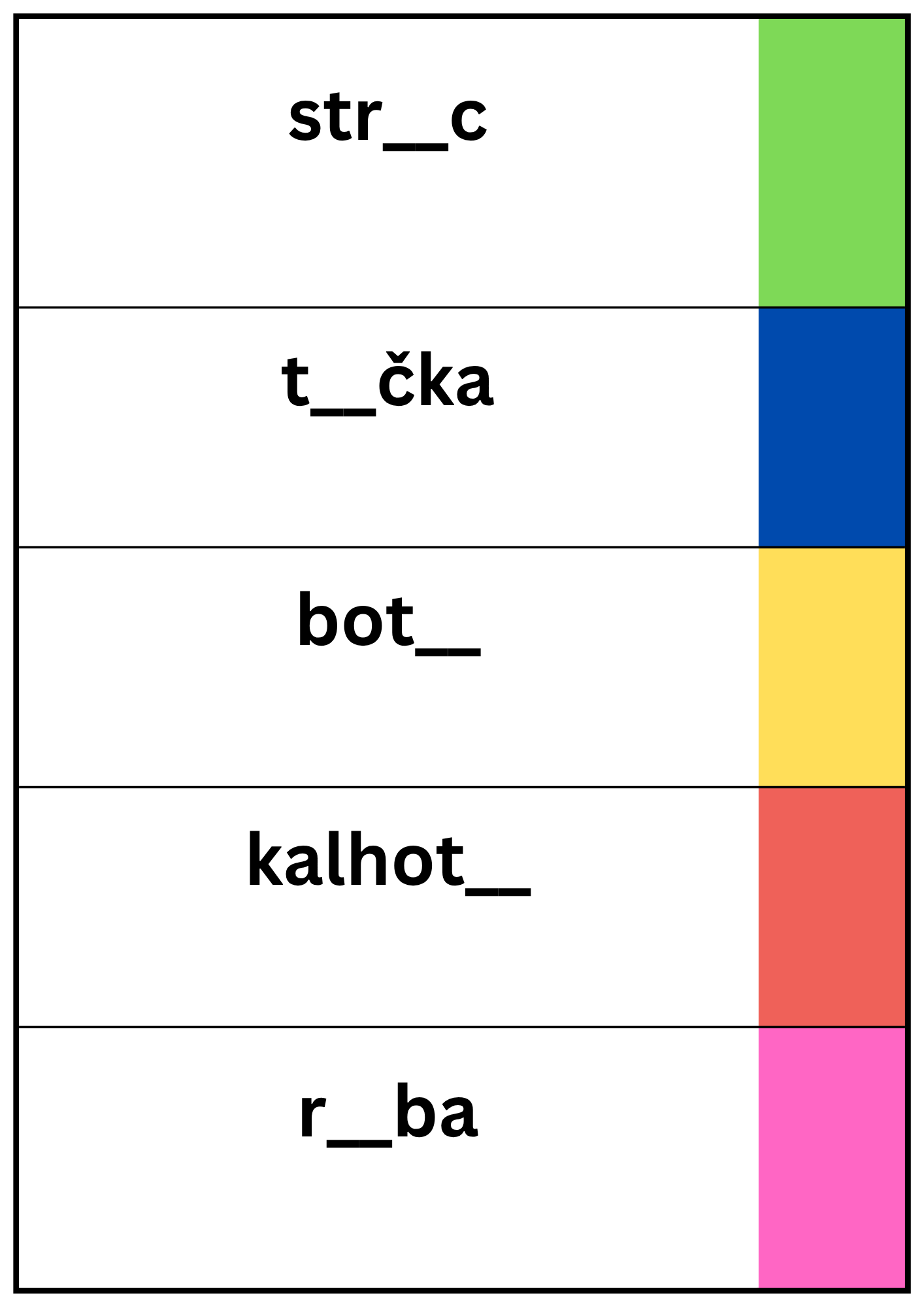 - Například: žák najde slovo str__c dle barevného pruhu zapíše i/y do své barevné tabulky. Následně si může výsledek samostatně zkontrolovat nebo kontrolujeme společně s ostatními žáky.