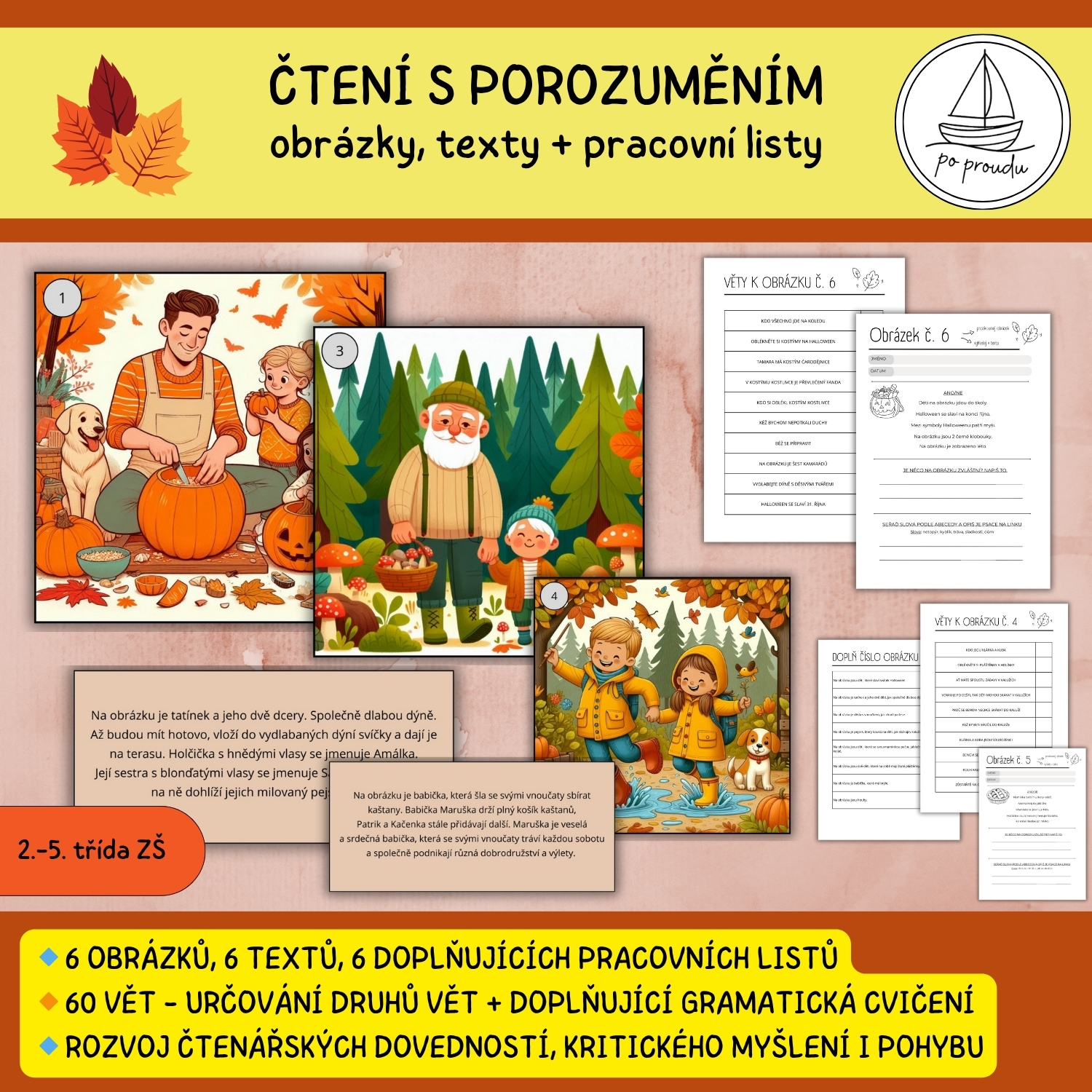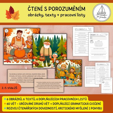 Komplexní podzimní materiál, který děti vtáhnou do práce s textem i obrázkem. Najdete v něm čtení s porozuměním, párovací úkoly, běhací čtení i procvičování druhů vět – vše s podzimní tematikou, která děti baví a motivuje k učení.