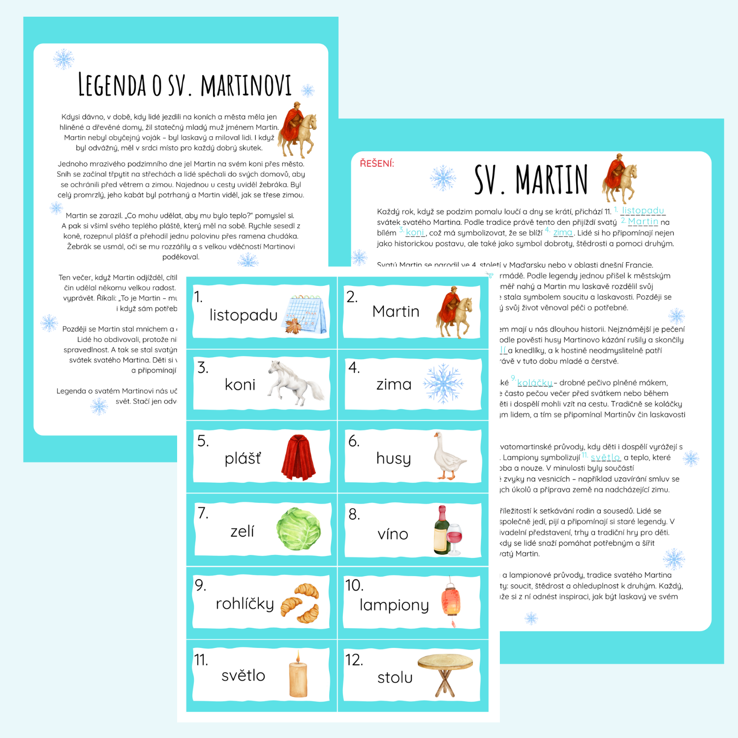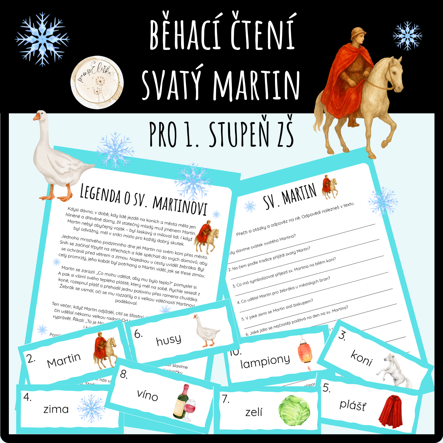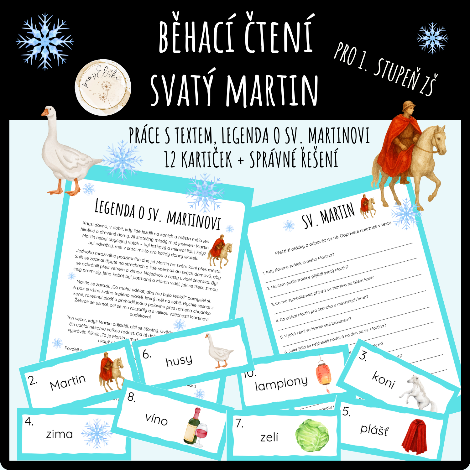 Materiál je určen pro žáky 1. stupně ZŠ a propojuje čtení s pohybovou aktivitou. Obsahuje text na doplnění a legendu o svatém Martinovi. Chybějící slova v textu musí žáci aktivně vyhledávat na kartičkách rozmístěných po třídě či chodbě. Následně pracují s otázkami k textu na pracovním listu.