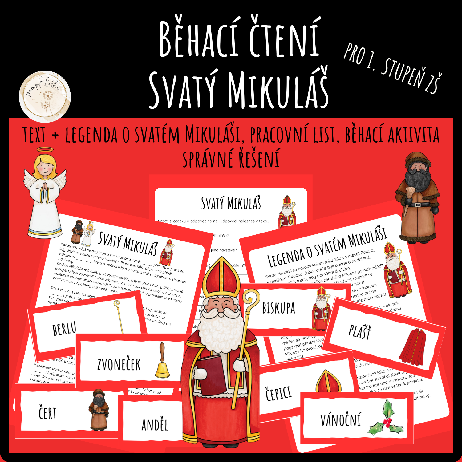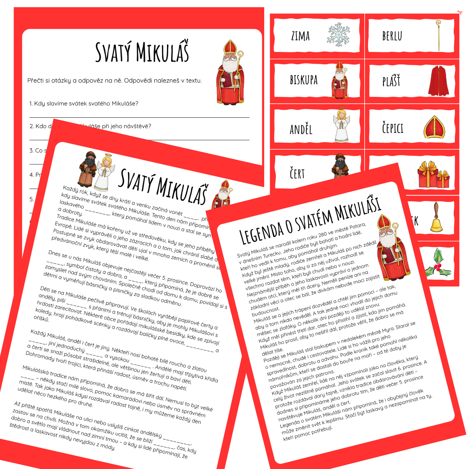 Materiál je určen pro žáky 1. stupně ZŠ a propojuje čtení s pohybovou aktivitou. Obsahuje text o tradici svatého Mikuláše, jeho životě a zvycích, které se s jeho svátkem pojí. Chybějící slova v textu musí žáci aktivně vyhledávat na kartičkách rozmístěných po třídě či chodbě. Následně pracují s otázkami k textu na pracovním listu.