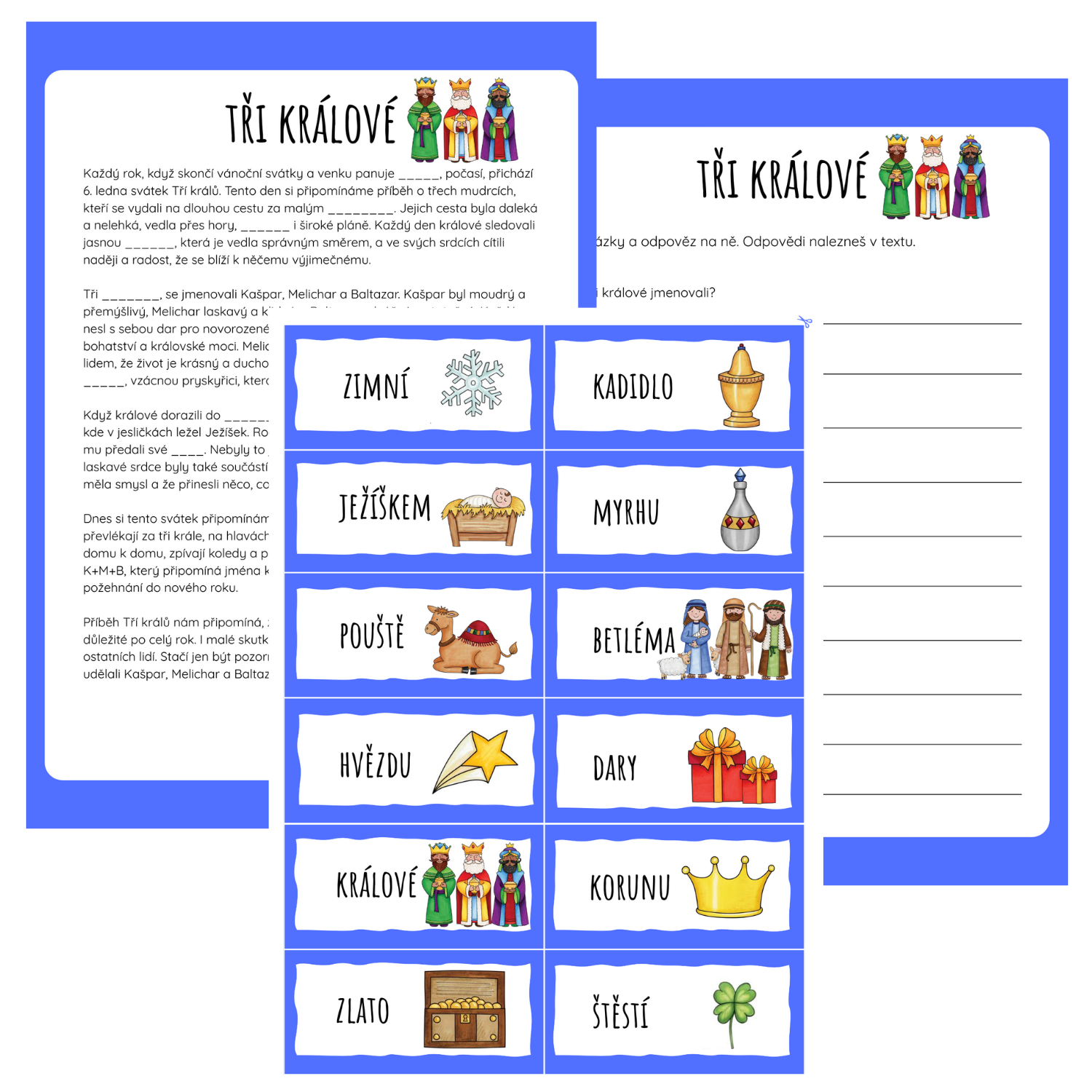 Materiál je určen pro žáky 1. stupně ZŠ a propojuje čtení s pohybovou aktivitou. Obsahuje text o tradici tří králů a jejich putování. Chybějící slova v textu musí žáci aktivně vyhledávat na kartičkách rozmístěných po třídě či chodbě. Následně pracují s otázkami k textu na pracovním listu.