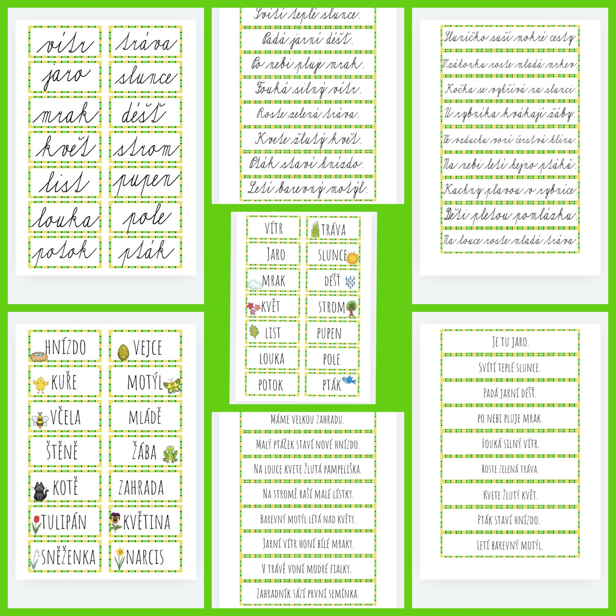 Materiál obsahuje celkem 28 jarních slov a 27 vět, a to vždy ve variantě s tiskacím i psacím písmem. Díky tomu lze aktivitu přizpůsobit aktuální fázi nácviku psaní – žáci mohou opisovat z tiskacího do psacího písma nebo pracovat pouze s jedním typem písma.