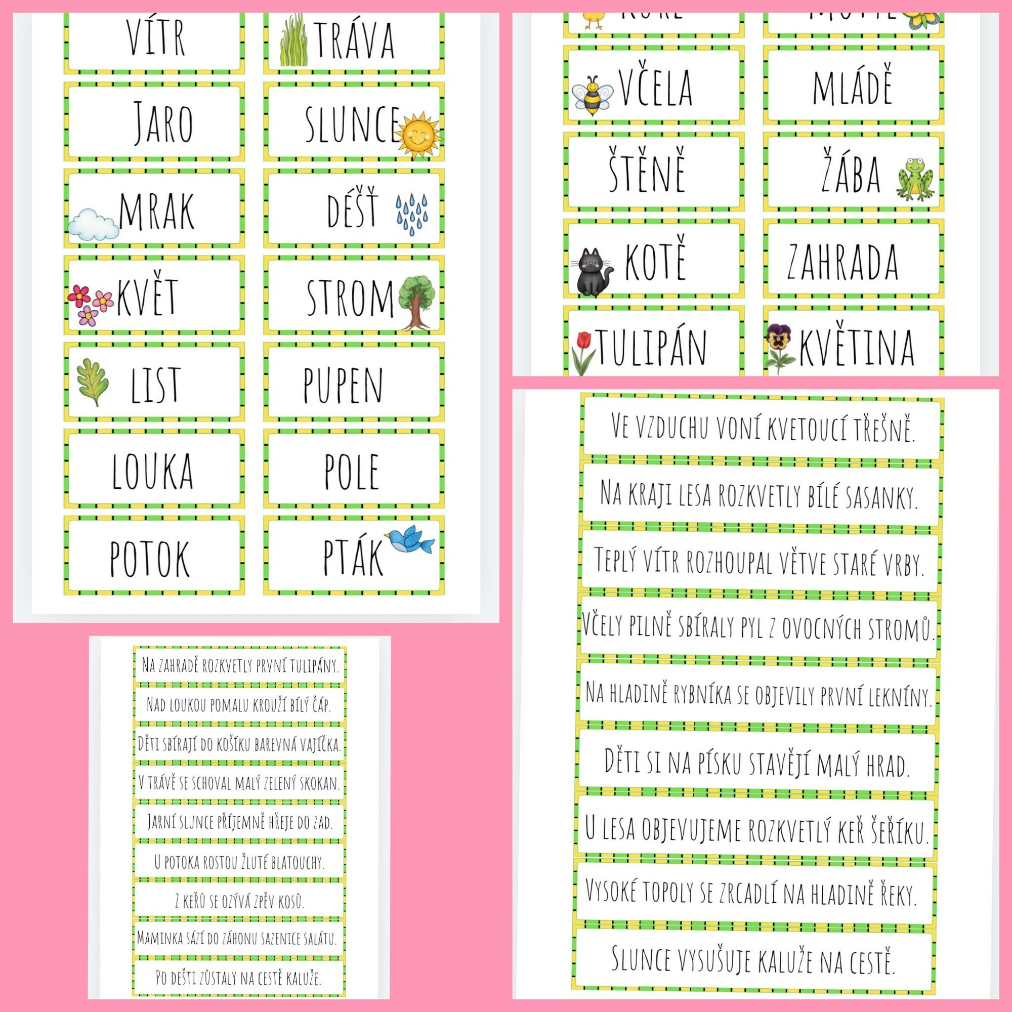 Materiál obsahuje 28 slov a 36 vět, které jsou gradované svou náročností a odpovídají věku žáků 1. stupně. Věty jsou stylizovány v přítomném čase, tematicky vycházejí z jarní přírody, zvyků a činností dětí. Texty jsou připraveny tak, aby podporovaly rozvoj pravopisných jevů probíraných ve 3.–5. ročníku.
