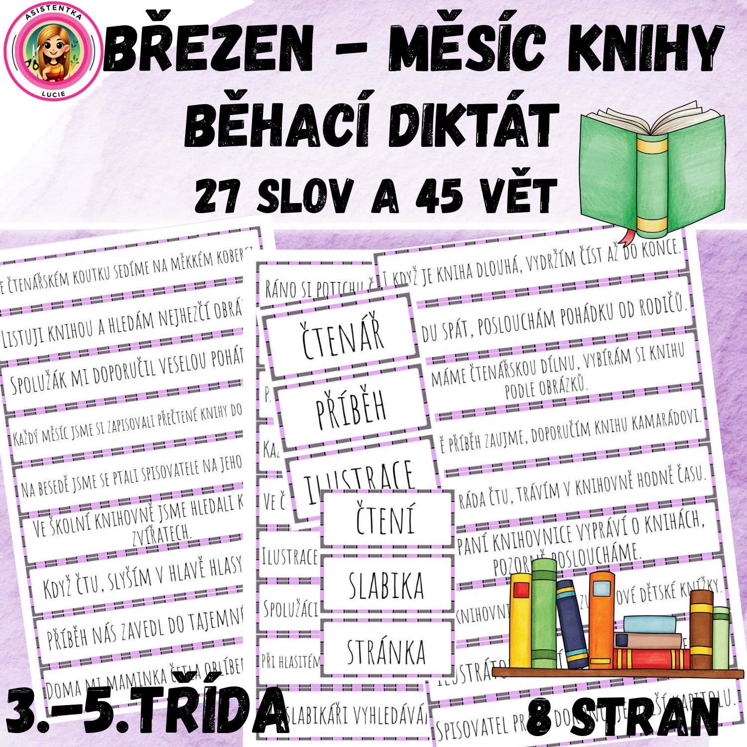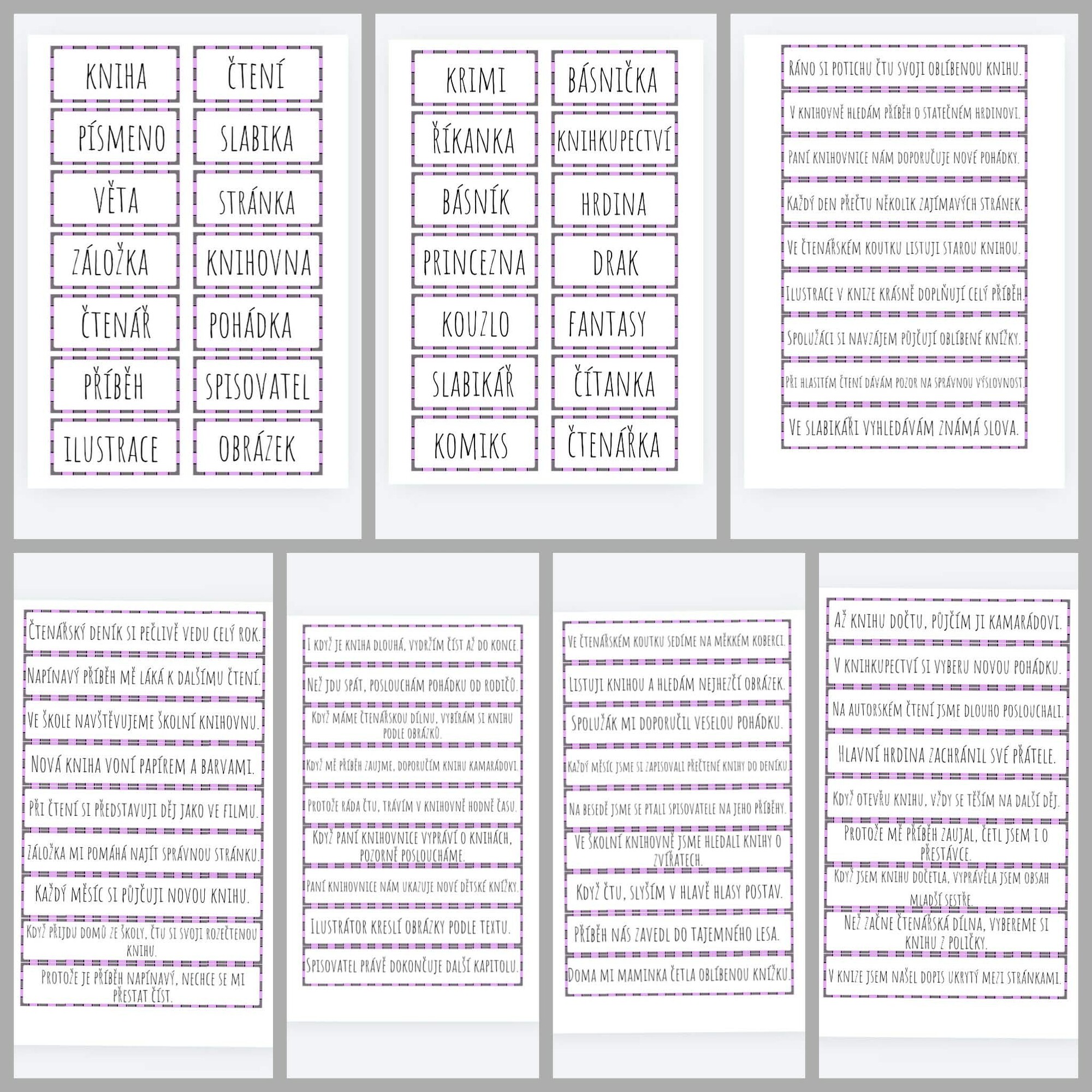 Materiál obsahuje 28 slov a 54 jedn vět. Náročnost odpovídá žákům 3.-5. ročníku – věty jsou srozumitelné a tematicky zaměřené na knihy, čtení, knihovnu a pohádky.