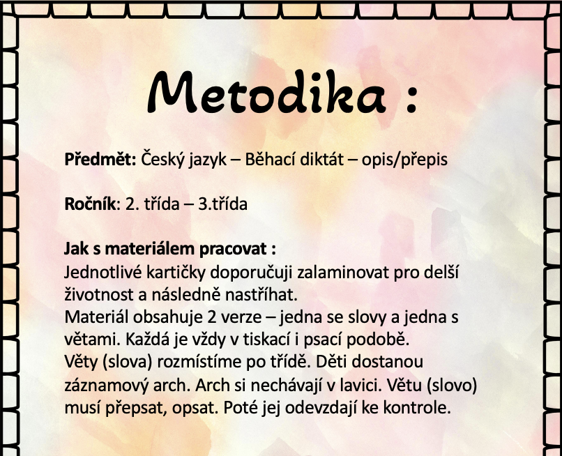 Věty (slova) rozmístíme po třídě. Děti dostanou záznamový arch. Arch sinechávají v lavici. Větu (slovo) musí přepsat, opsat. Poté jej odevzdají ke kontrole.
