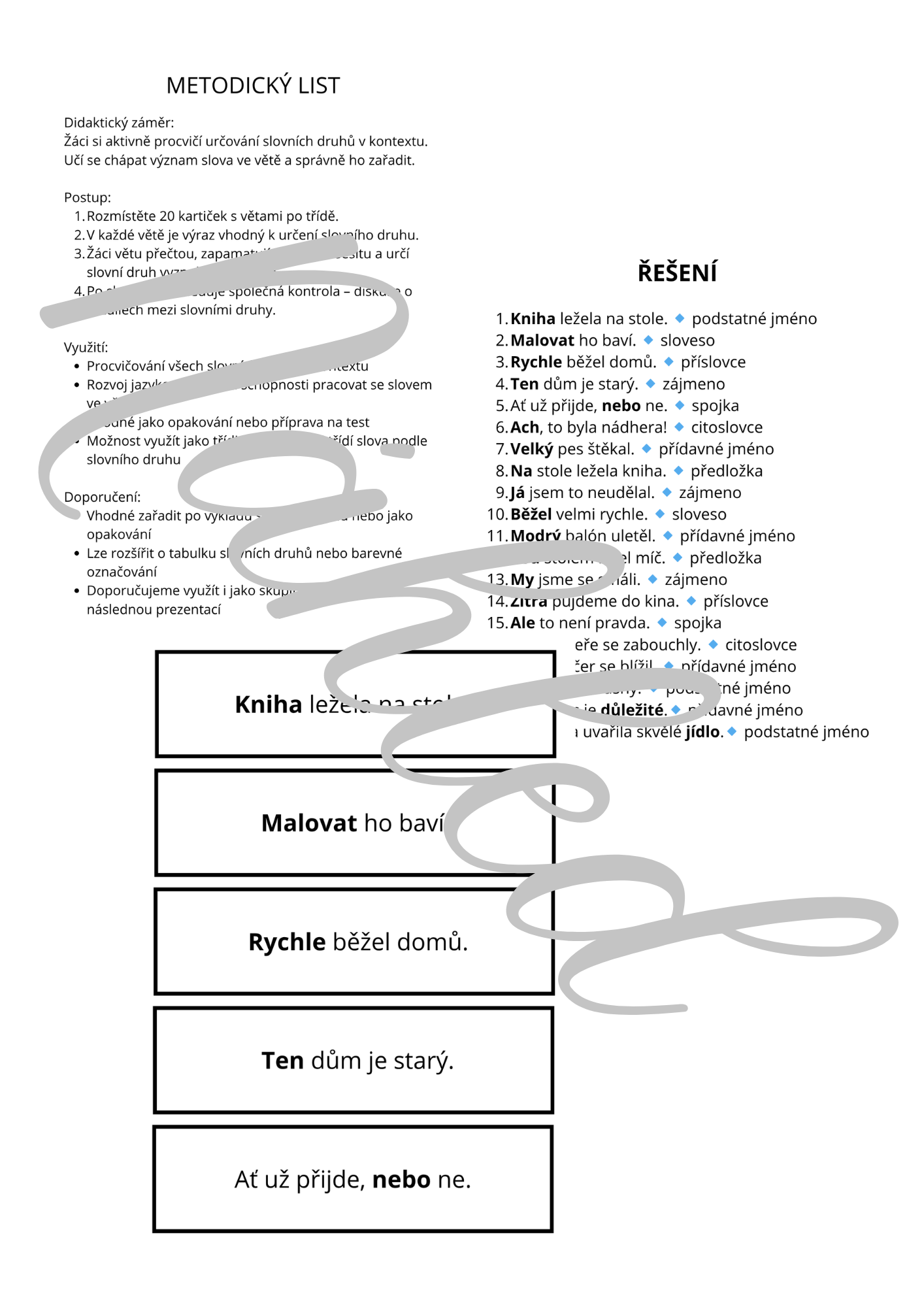 Věty zahrnují všech deset slovních druhů a vedou žáky k hlubšímu porozumění významu slova. Aktivita je vhodná jako opakování, rozcvička nebo skupinová práce. Lze ji rozšířit o třídění slov, barevné označování nebo tvorbu vlastních vět.