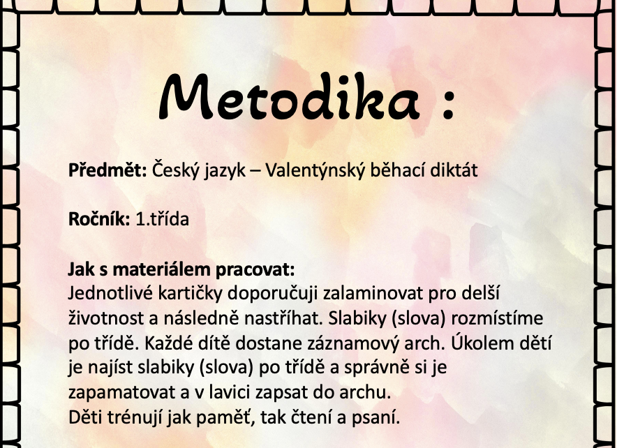 Jednotlivé kartičky doporučuji zalaminovat pro delší životnost a následně nastříhat. Slabiky (slova) rozmístíme po třídě. Každé dítě dostane záznamový arch. Úkolem dětí je najíst slabiky (slova) po třídě a správně si je zapamatovat a v lavici zapsat do archu.