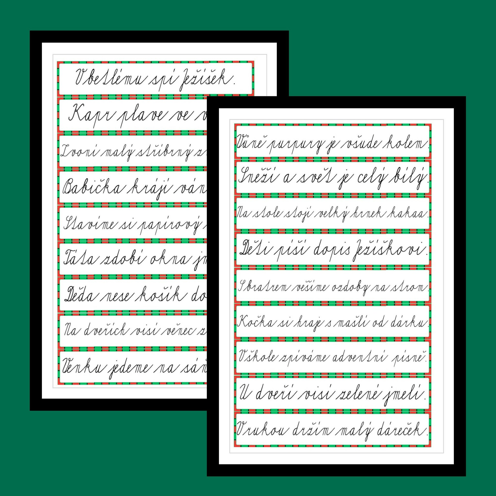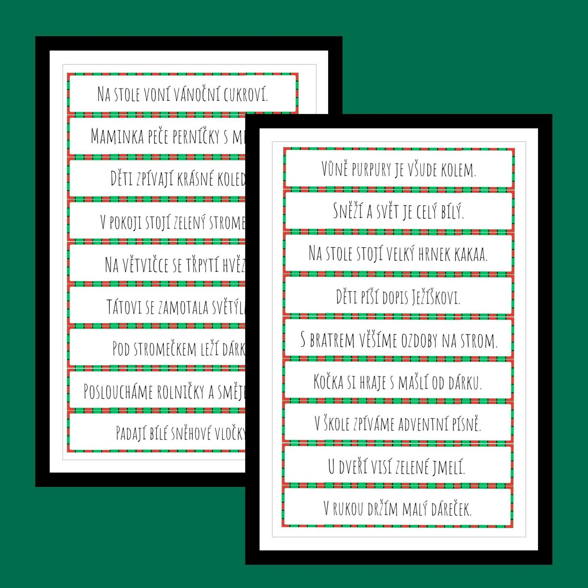 Materiál obsahuje 28 vánočních slov a 27 nenavazujících vět vhodných pro žáky 2. ročníku ZŠ. Věty jsou krátké, jednoduché a tematicky zaměřené na Vánoce. Kartičky jsou připraveny ve dvou variantách – tiskací písmo a psací písmo, aby bylo možné přizpůsobit výuku potřebám třídy.
