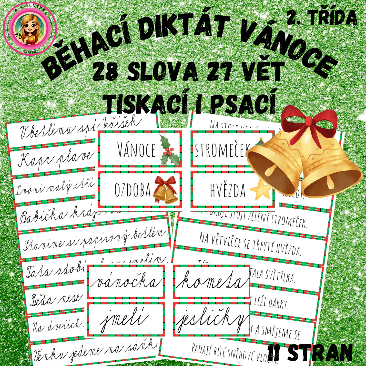 Tento materiál slouží k procvičení psaní slov a vět formou pohybové aktivity. Žáci běhají k rozmístěným kartičkám se slovy nebo větami, přečtou si text, zapamatují si ho a přepíší jej do svého pracovního listu. Cílem je rozvoj krátkodobé paměti, pozornosti, čtení s porozuměním, správného přepisu a psaní bez chyb. Aktivita je vhodná do výuky českého jazyka, na stanoviště, do skupinové práce i jako odlehčená vánoční výuka.
