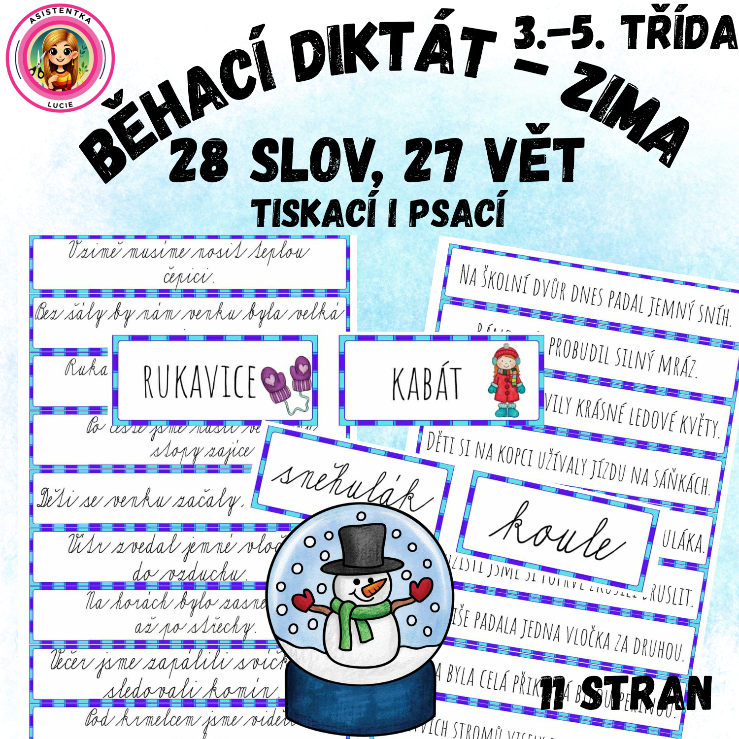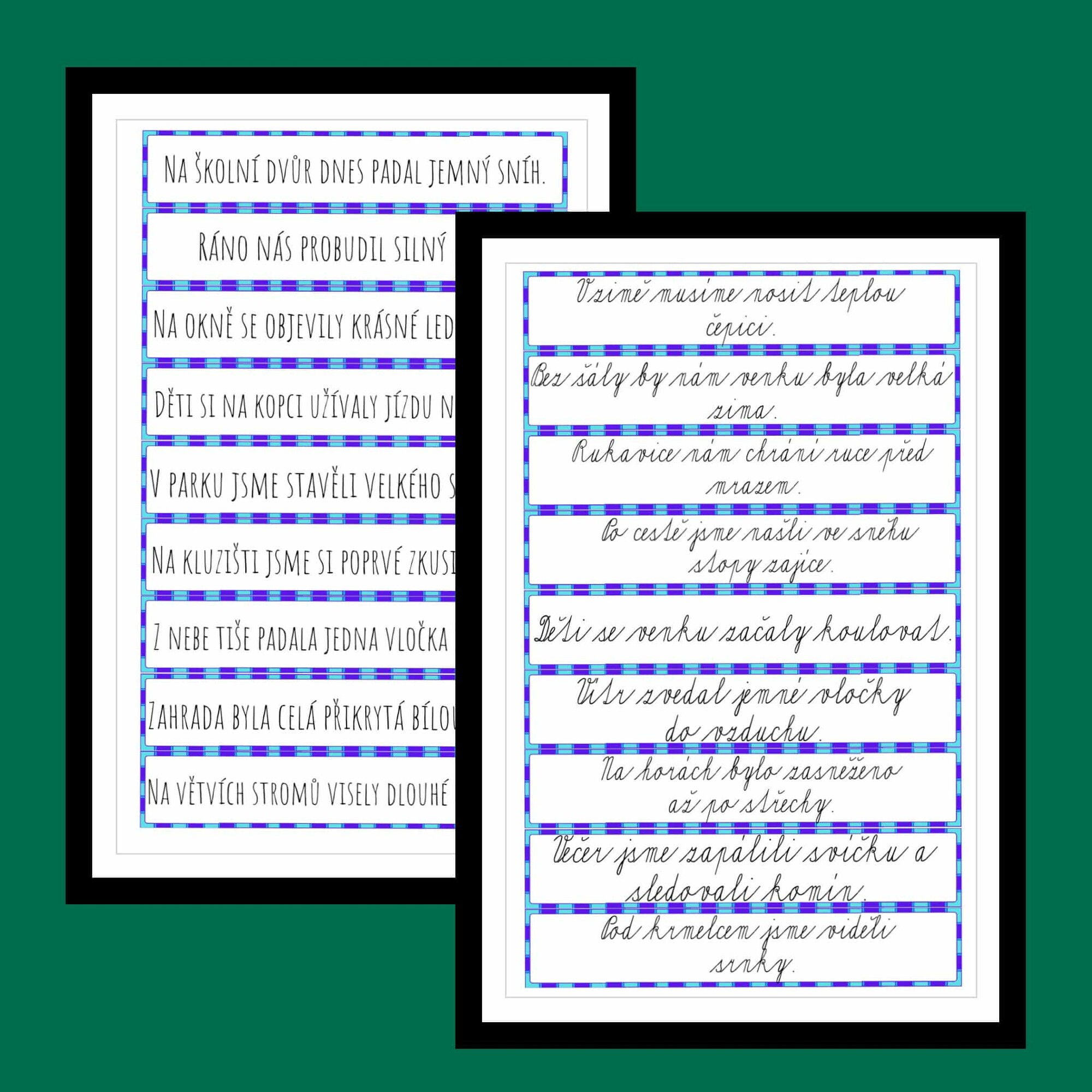 Materiál obsahuje 28 zimních slov a 27 krátkých vět přizpůsobených žákům 3. - 5. ročníku ZŠ. Věty jsou jednoduché, srozumitelné, bez složitých jazykových jevů a jsou vhodné pro nácvik čtení, psaní, soustředění a rozvoje pravopisných dovedností.
