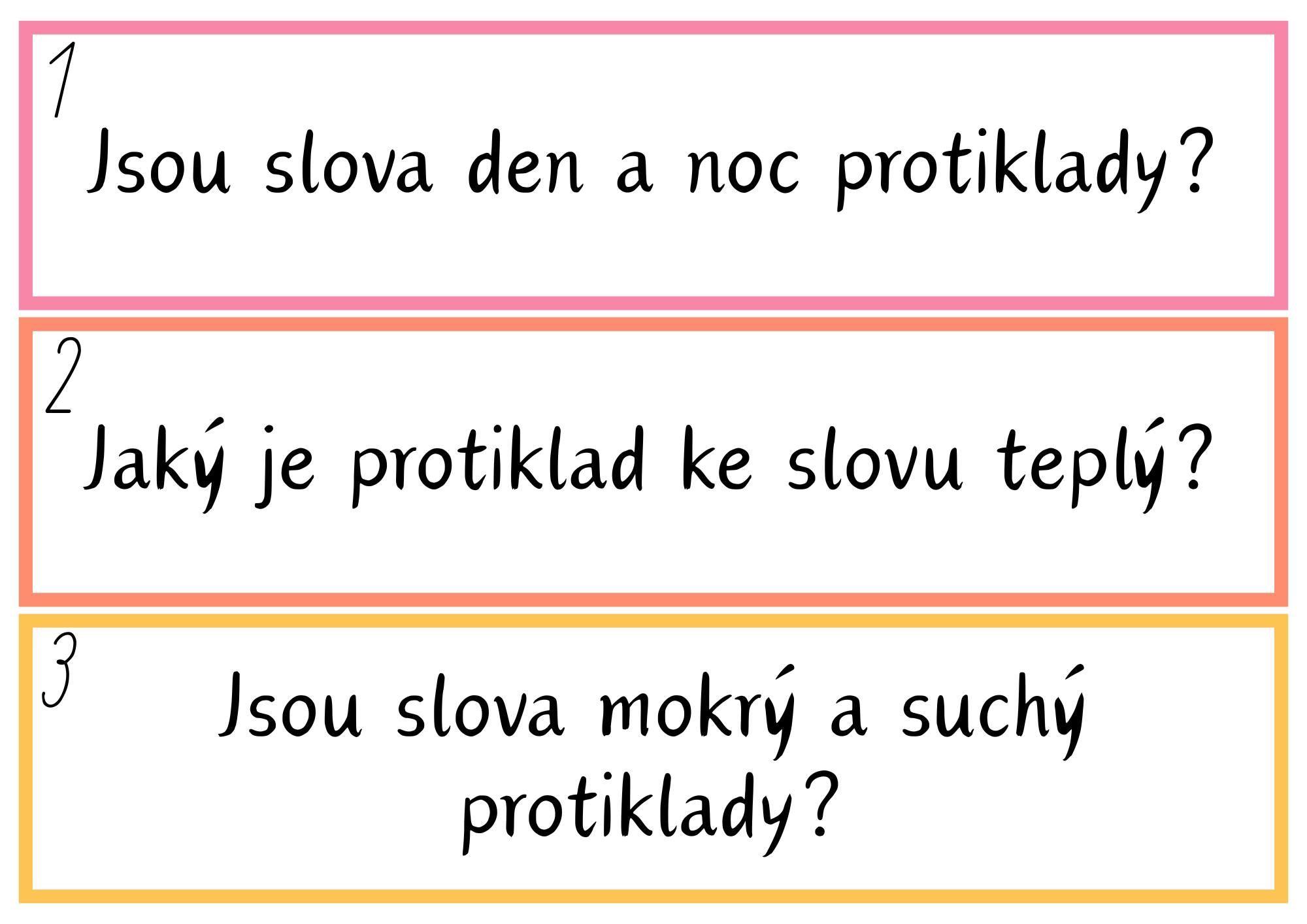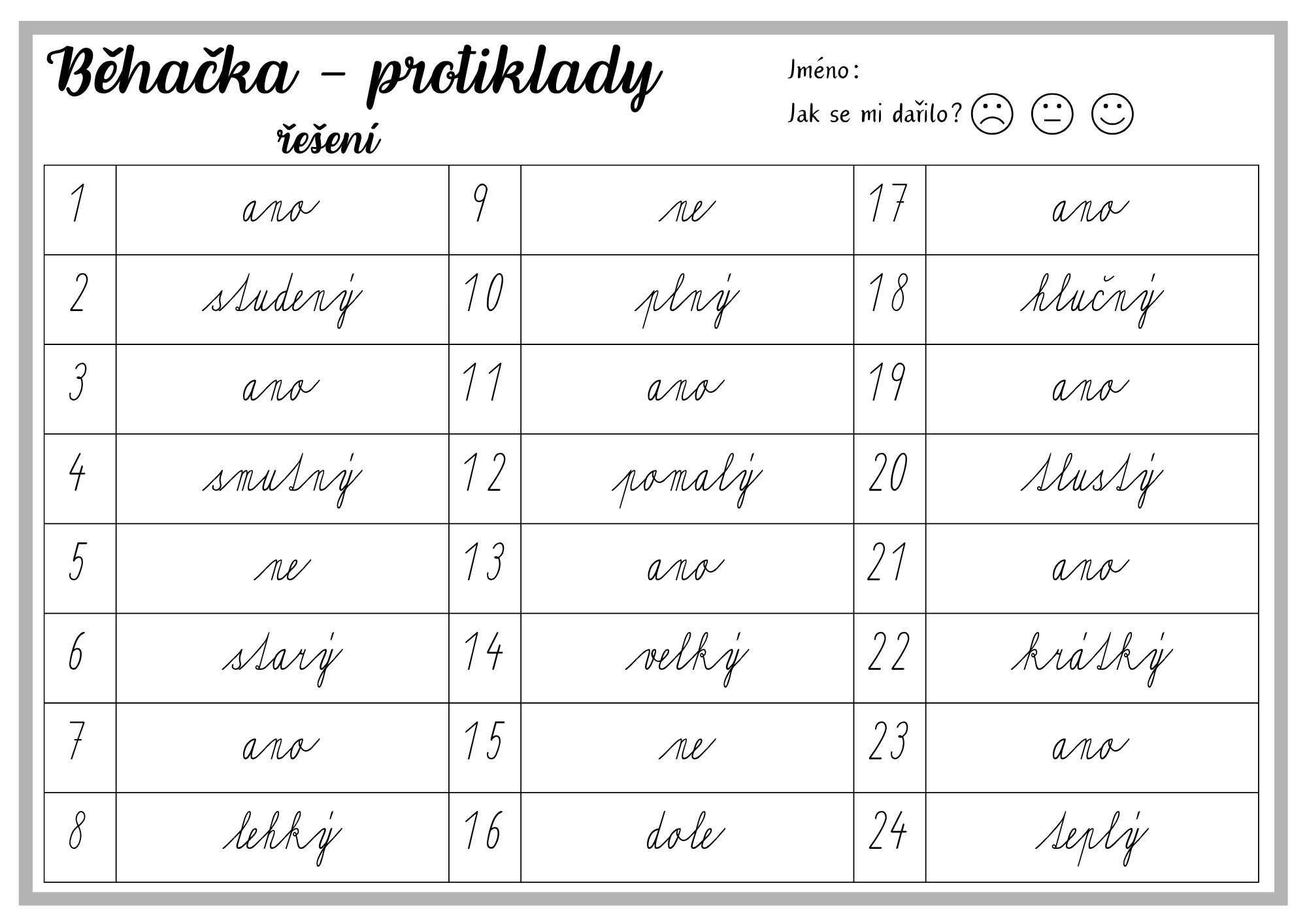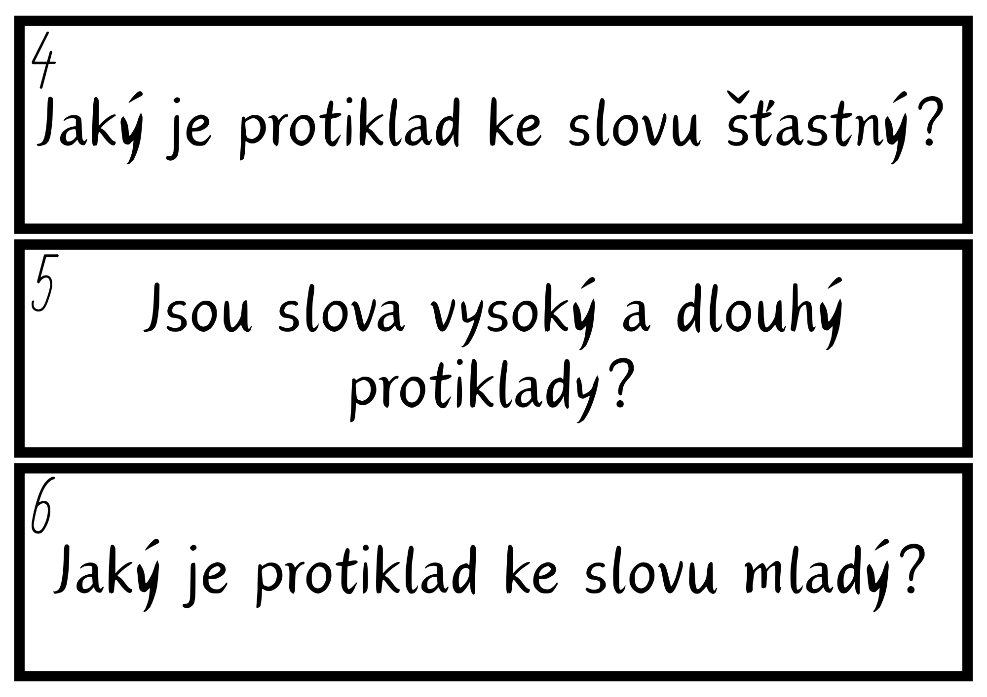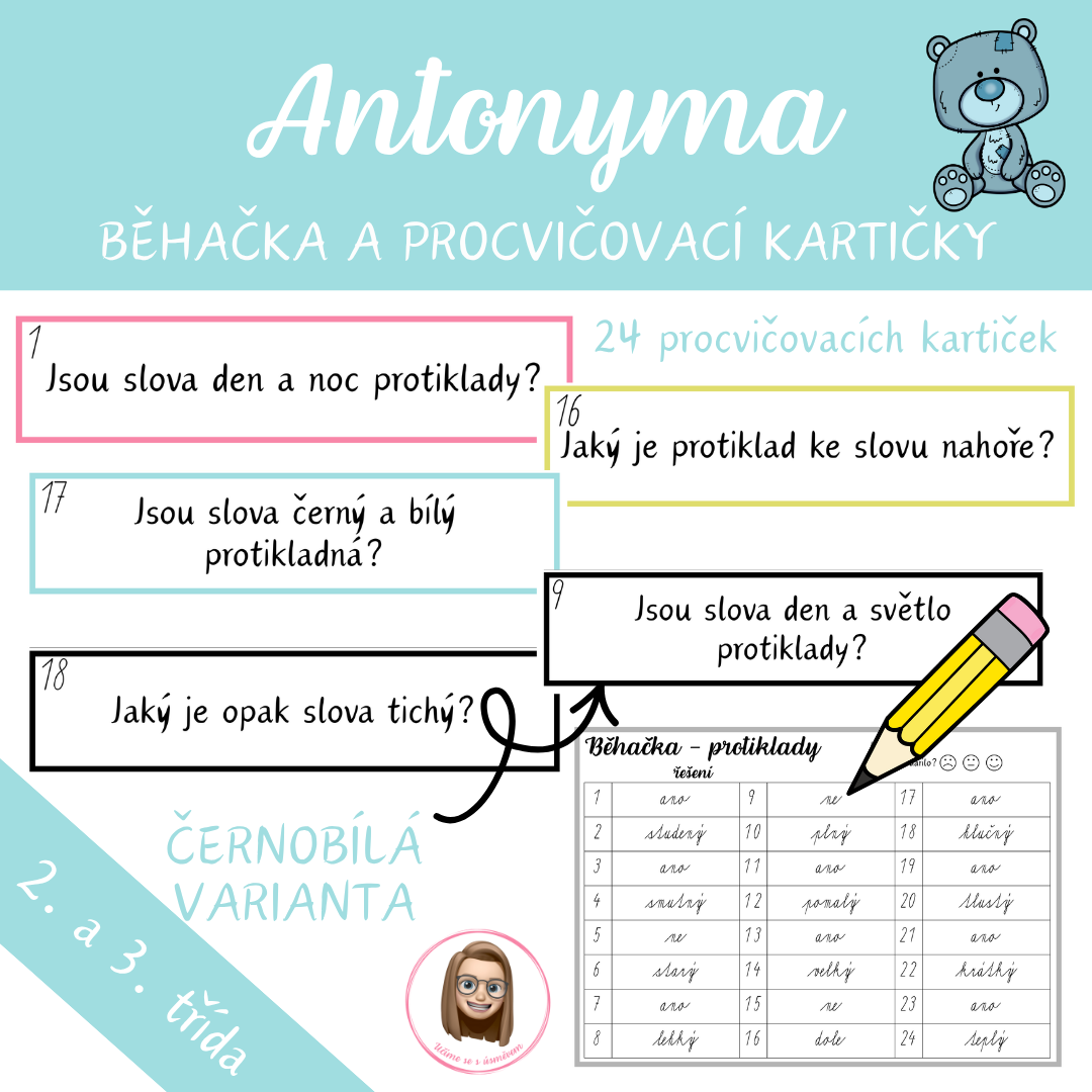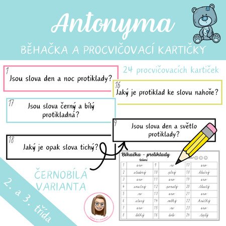 Zábavná běhačka na procvičení antonym! Děti běhají po třídě, hledají kartičky, doplňují protiklady nebo určují ANO/NE. Rozvíjí slovní zásobu, čtení i logické myšlení. Barevná i černobílá varianta.