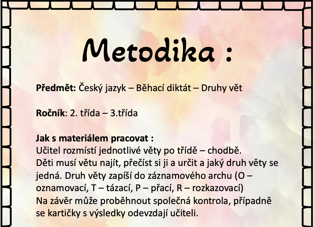 Děti musí větu najít, přečíst si ji a určit a jaký druh věty se jedná. Druh věty zapíší do záznamového archu (O – oznamovací, T – tázací, P – přací, R – rozkazovací)