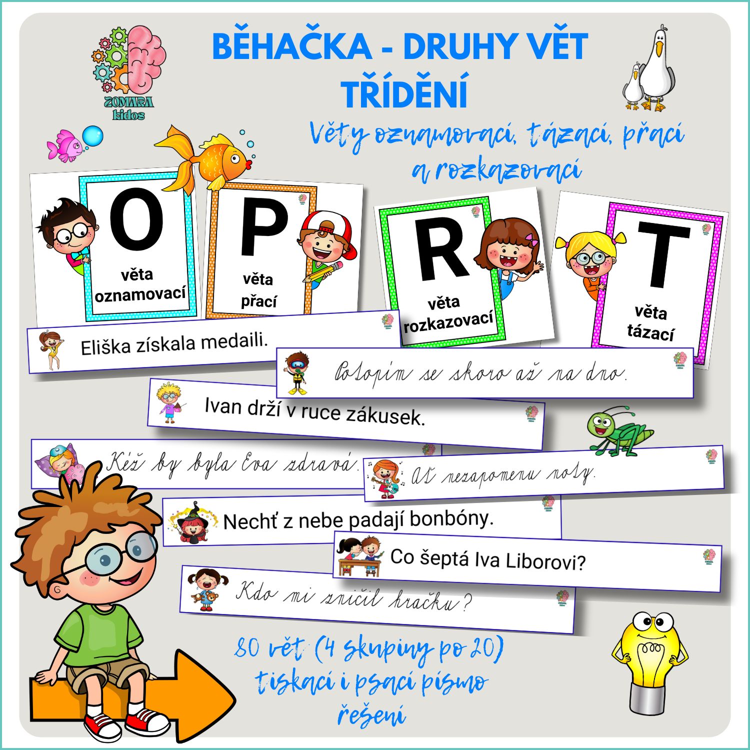 Oznamovací, tázací, rozkazovací nebo přací? Procvičte druhy vět hravou formou. 80 vět s řešením, dvě varianty písma a různé možnosti využití – běhačka, psaní, počítání slov, čtení, ale třeba i nácvik intonace. Vhodné k laminaci.