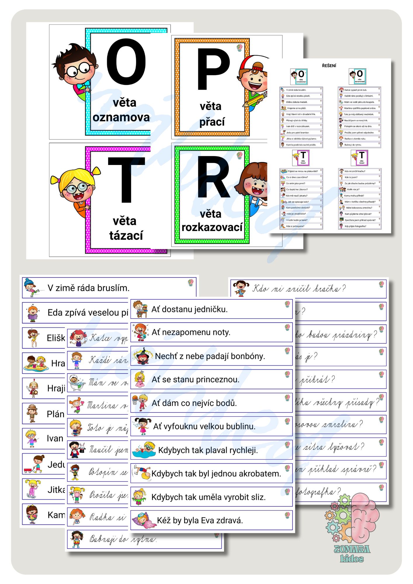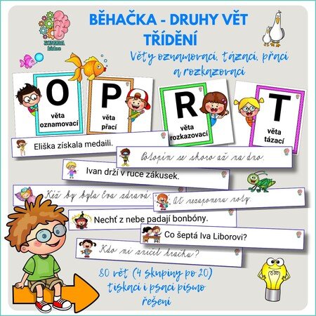 Příprava: Připravte karty s označením druhů vět (O, T, R, P) a rozmístěte je po třídě. Kartičky s větami dejte na jednu hromadu nebo do krabice, odkud si je děti budou brát. Aktivita je vhodná i k laminaci.