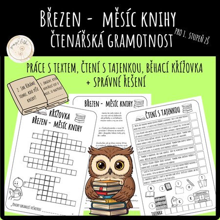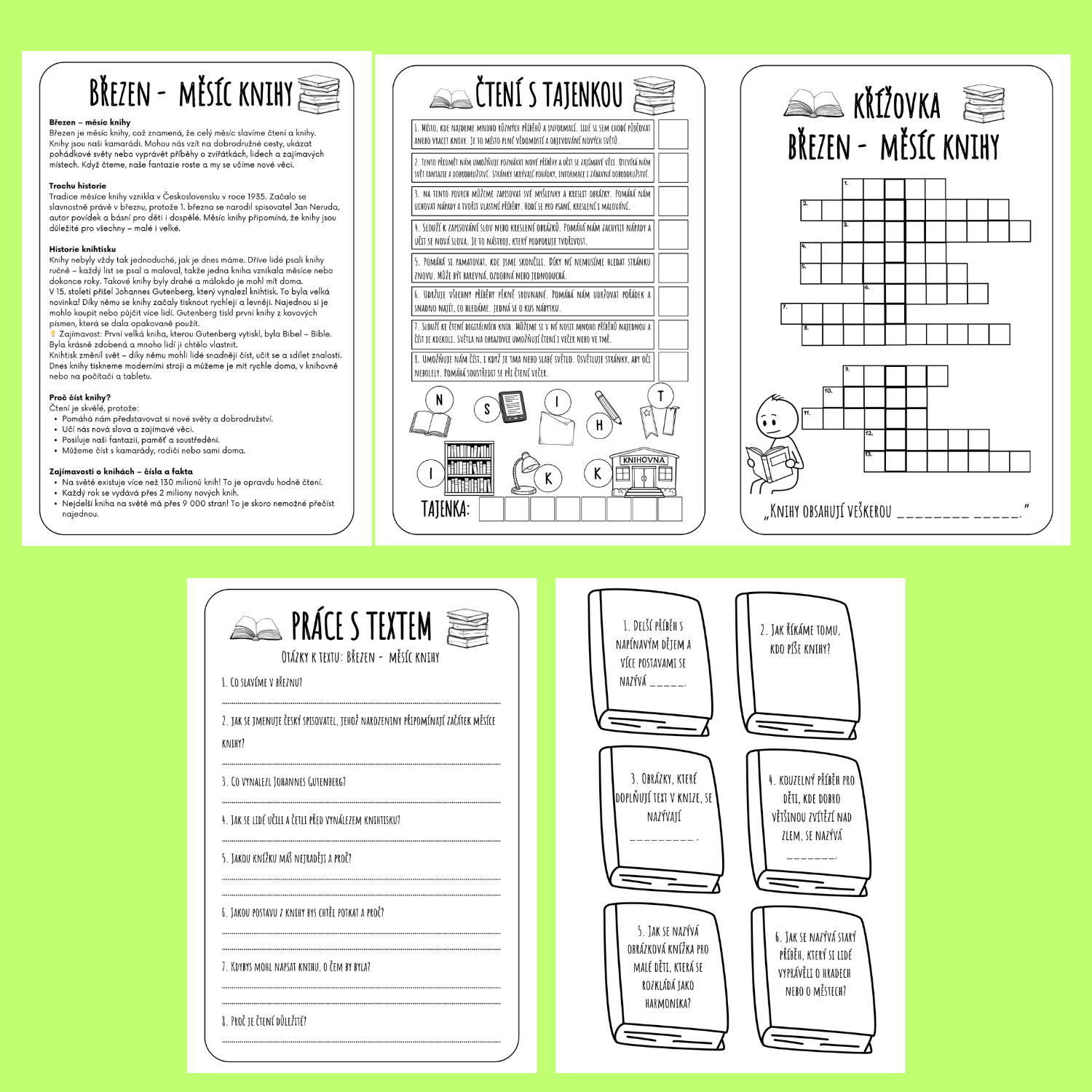 ráda bych Vám představila soubor aktivit zaměřených na rozvoj čtenářské gramotnosti a práci s textem. Tentokrát je materiál věnován tématu Březen - měsíc knihy. Soubor je určen pro žáky 1. stupně a je vhodný k využití v hodinách čtení a českého jazyka.