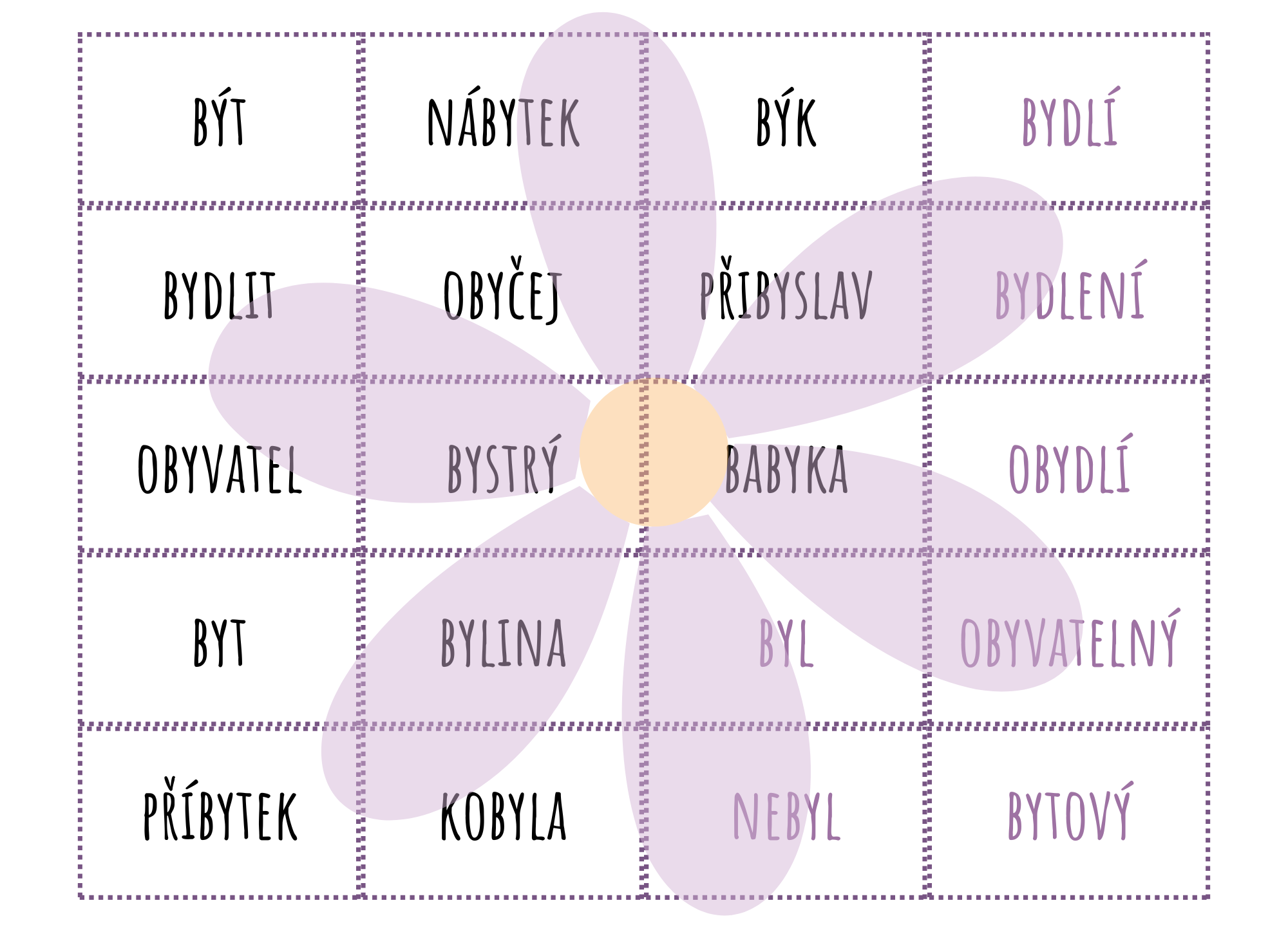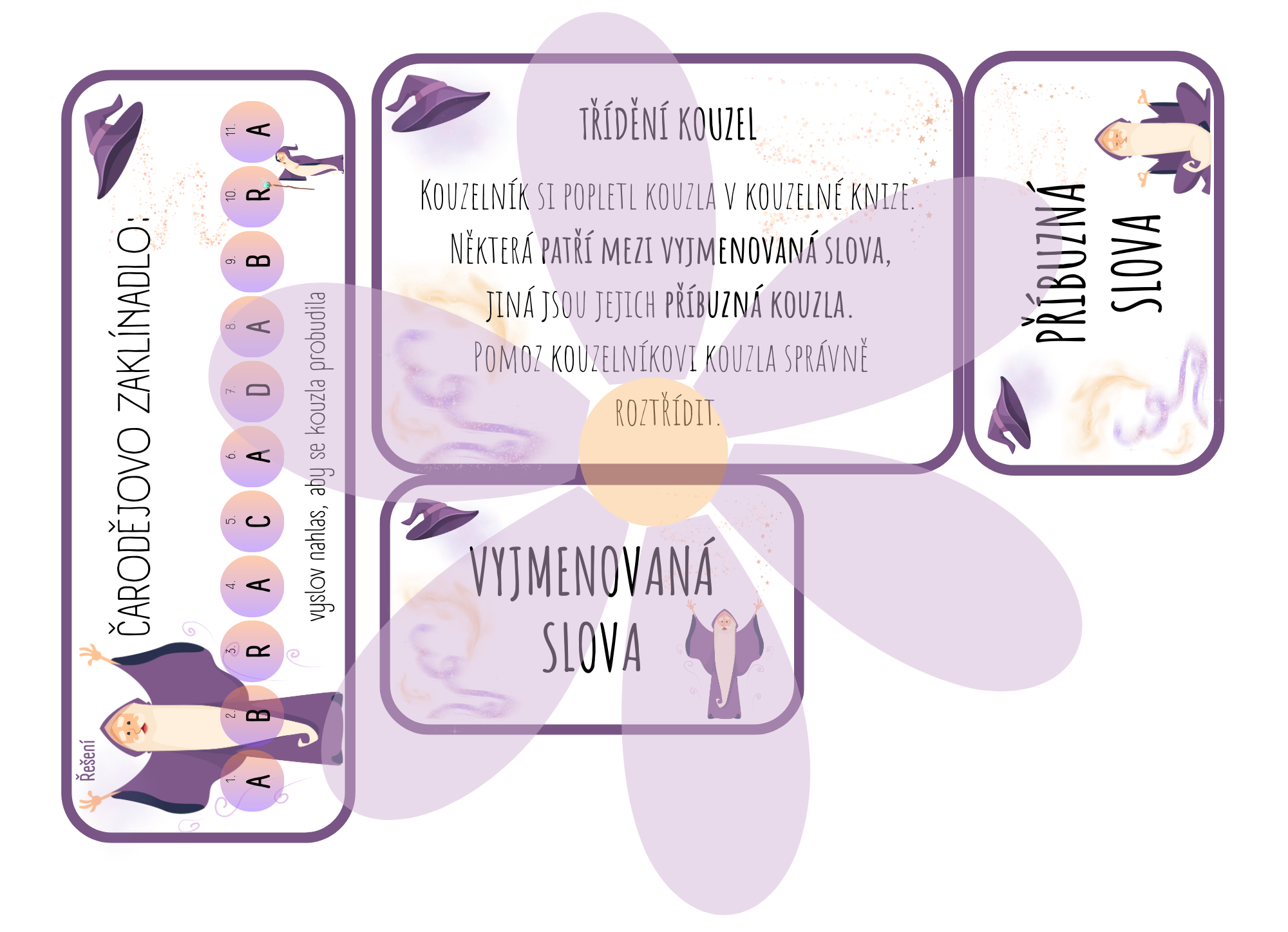 Součástí materiálu je také aktivita Třídění kouzel, která slouží k upevnění znalostí vyjmenovaných slov po B, jejich příbuzných slov. Žáci zde rozvíjejí nejen pravopisné dovednosti, ale také porozumění významu slov a schopnost jejich třídění.