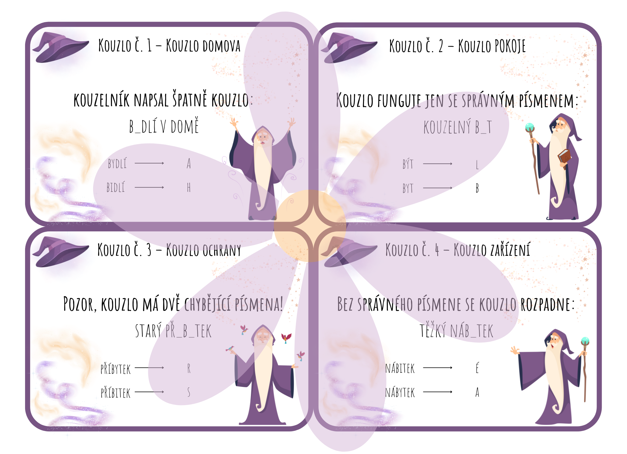 Materiál obsahuje kouzelnickou bojovku, ve které žáci postupně plní úkoly, opravují „rozbitá kouzla“ a sbírají písmena do tajenky. Správným doplňováním I / Y ve vyjmenovaných slovech pomáhají kouzelníkovi znovu seslat kouzlo a vyluštit zaklínadlo.