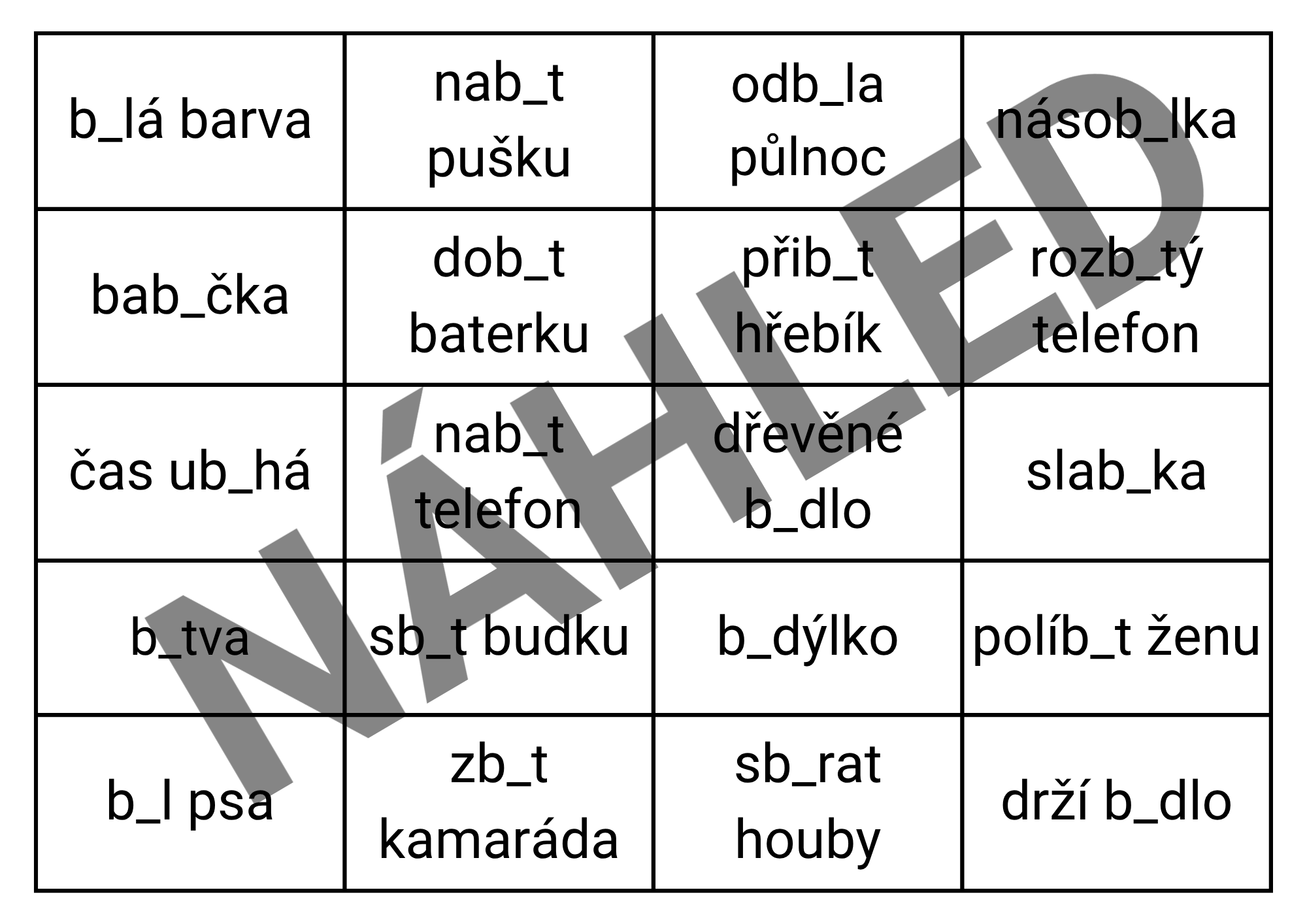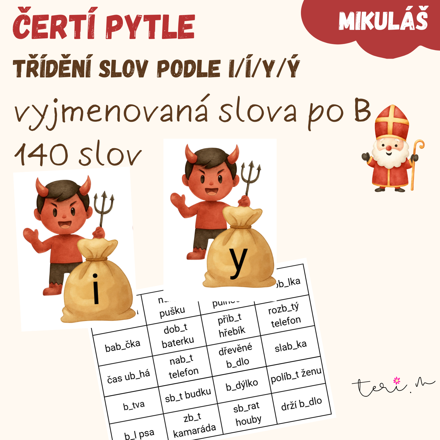Soubor obsahuje 4 čerty, každý s vlastním pytlem – i, í, y, ý – a k tomu 140 slov, která mají děti správně roztřídit. Materiál rozvíjí nejen pravopis, ale také logické třídění, pozornost a práci s významem slov.