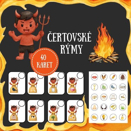 Soubor obsahuje 40 rýmů (40 karet + 40 obrázků koleček) v PDF. V pytli každého čerta se nachází obrázek, který se rýmuje pouze s jedním obrázkem v kolečku. Aktivita pro rozvoj sluchového vnímání je vhodná pro děti, které neumí číst, ale i pro ty, co číst už umí.