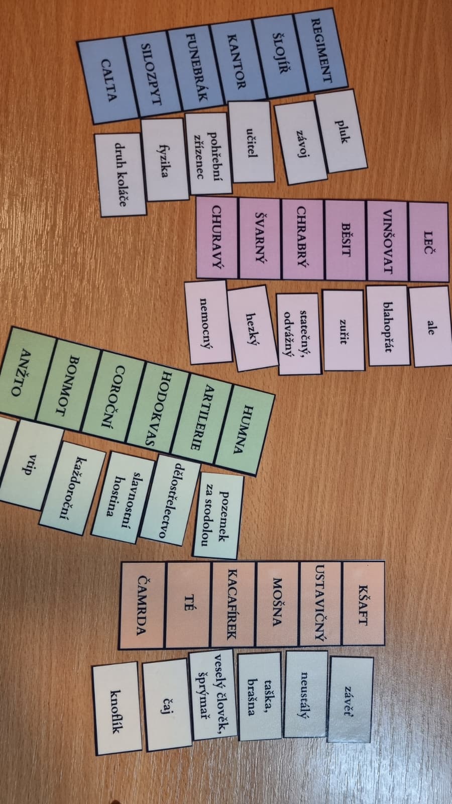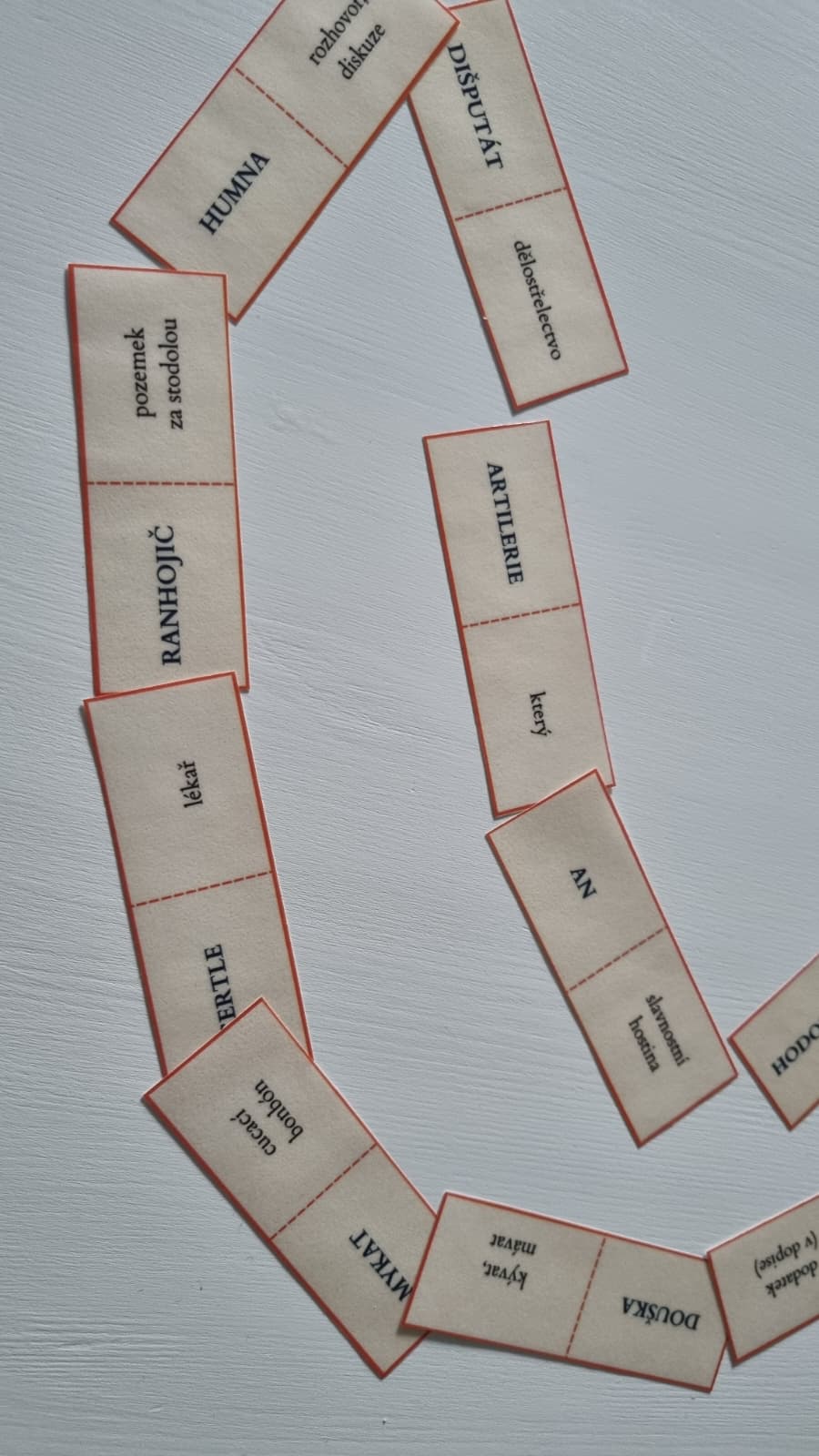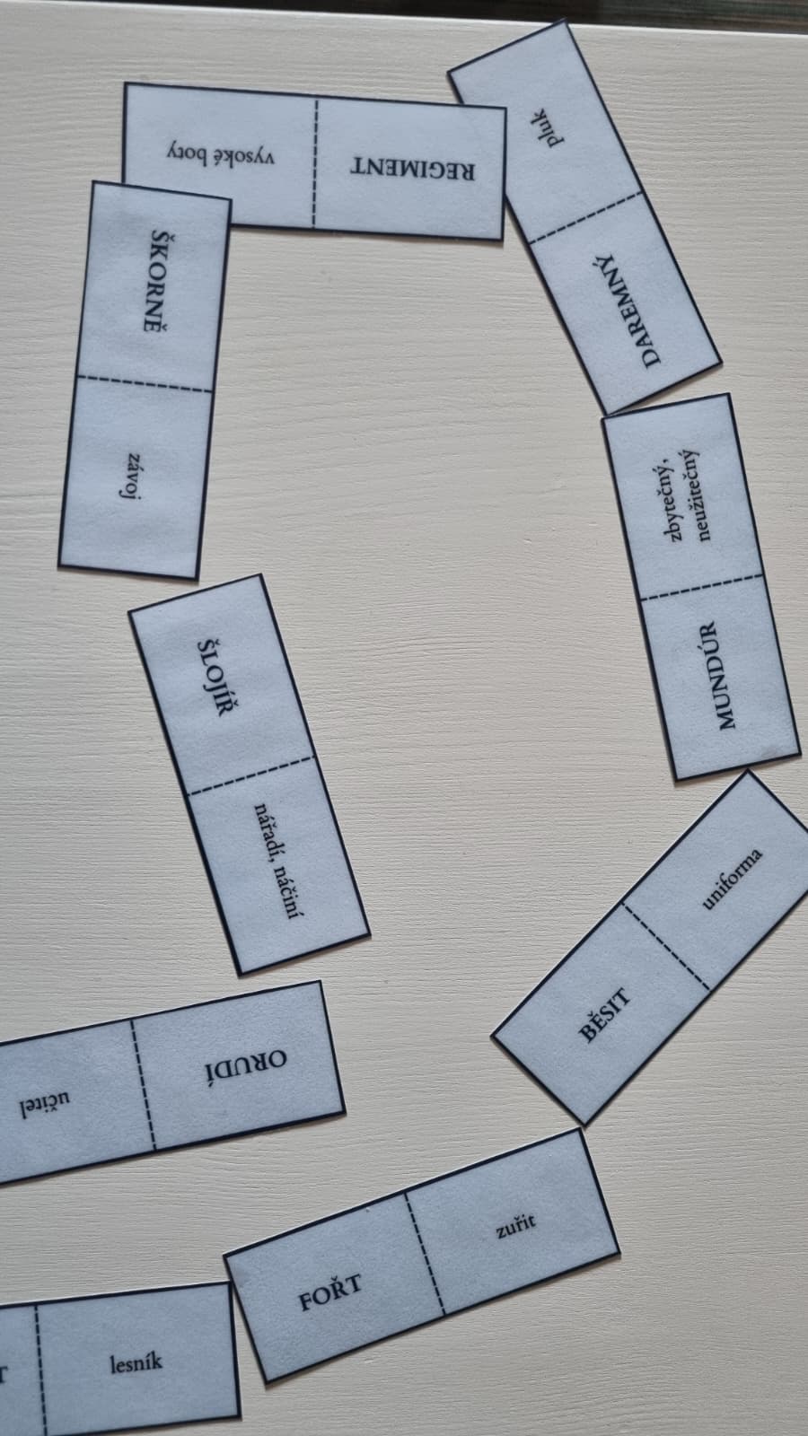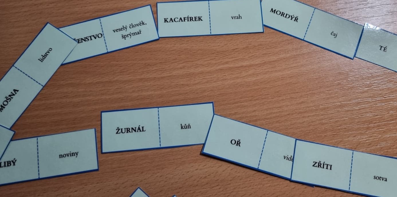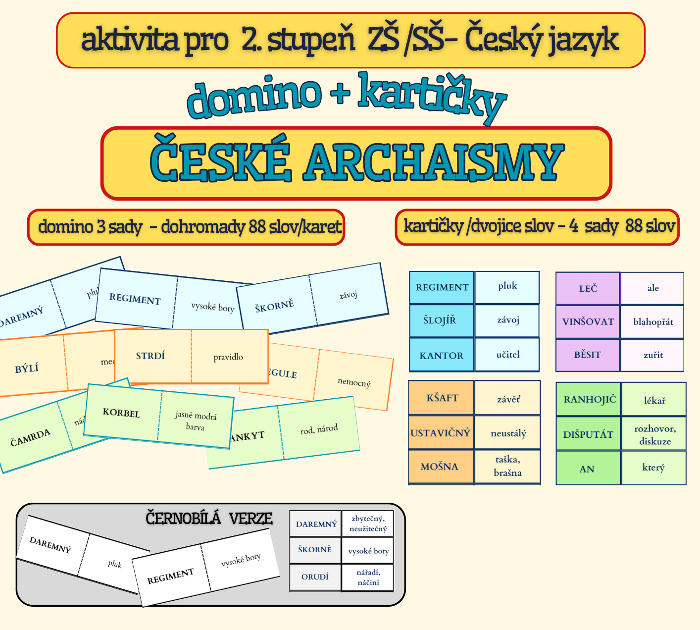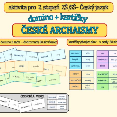 Tento materiál obsahuje hru typu DOMINO a kartičky dvojic slov, kde si žáci procvičí ČESKÉ ARCHAISMY.