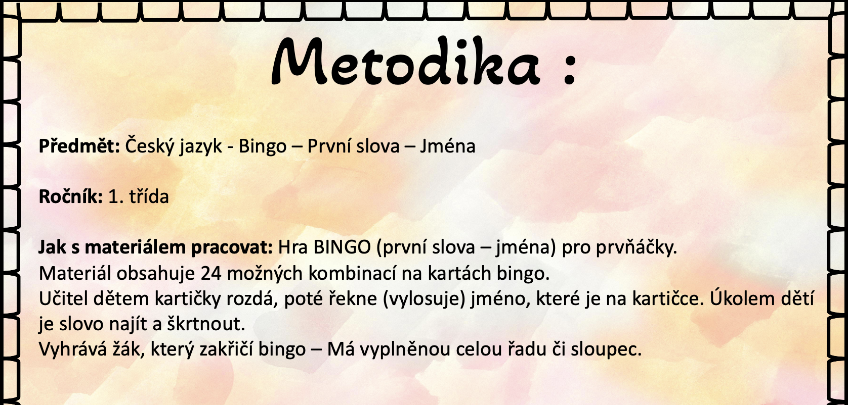 Materiál obsahuje 24 možných kombinací na kartách bingo.
