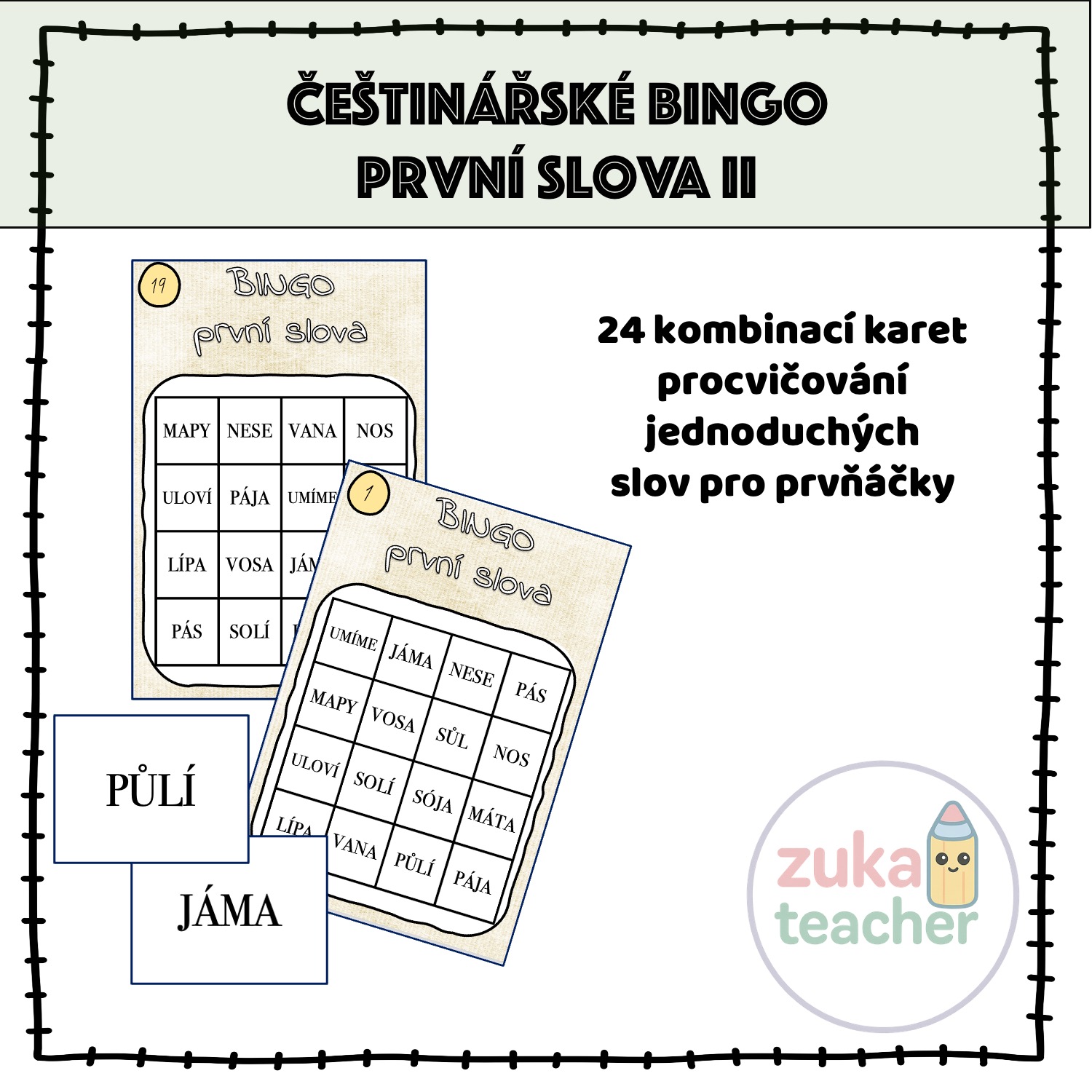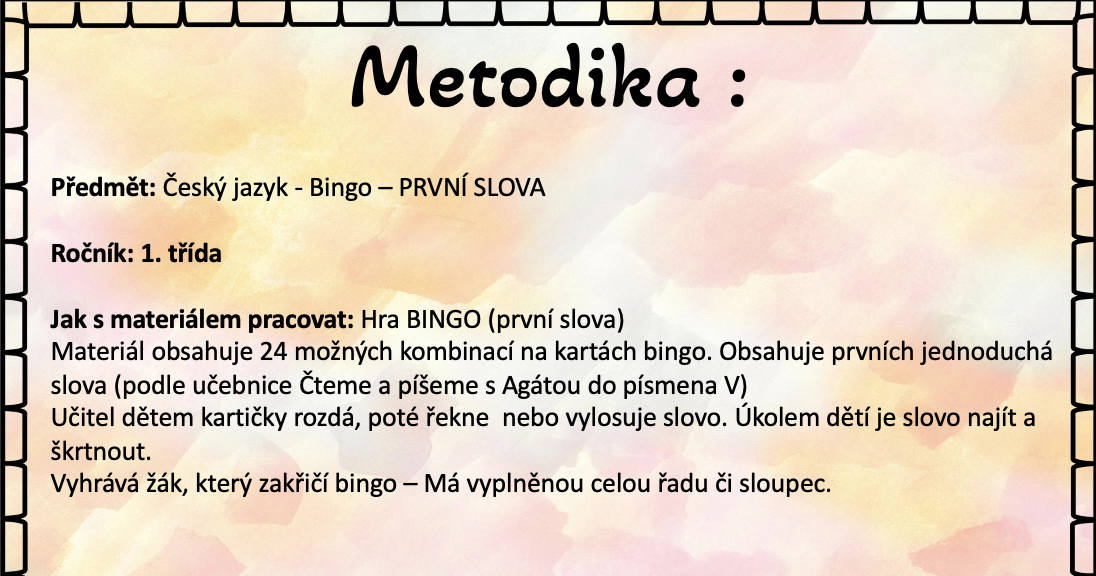 Materiál obsahuje 24 možných kombinací na kartách bingo. Obsahuje prvních jednoduchá slova (podle učebnice Čteme a píšeme s Agátou do písmena V)