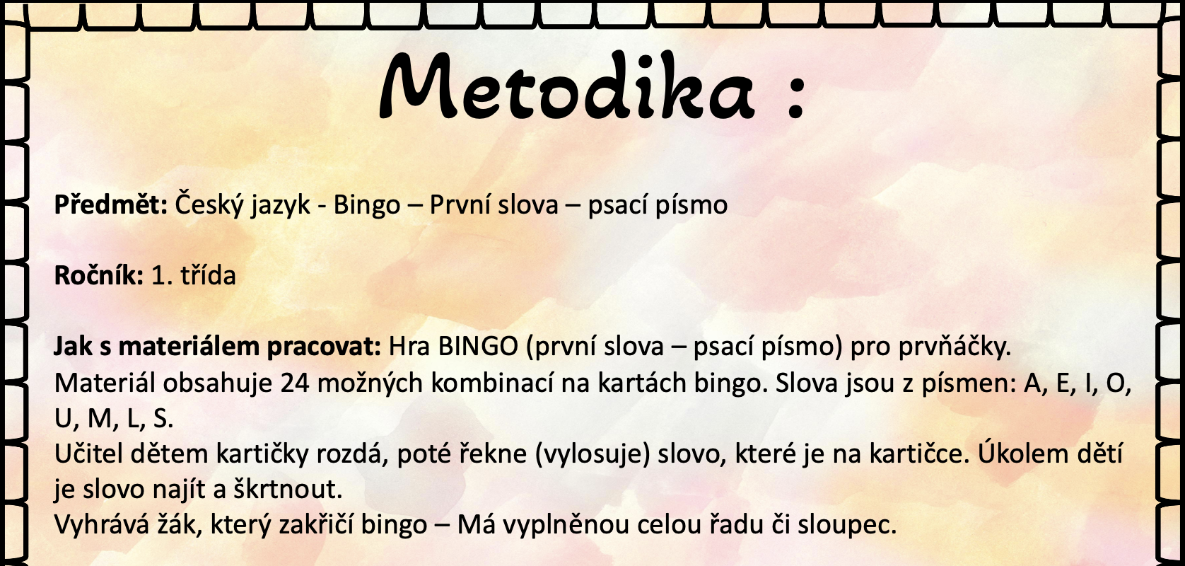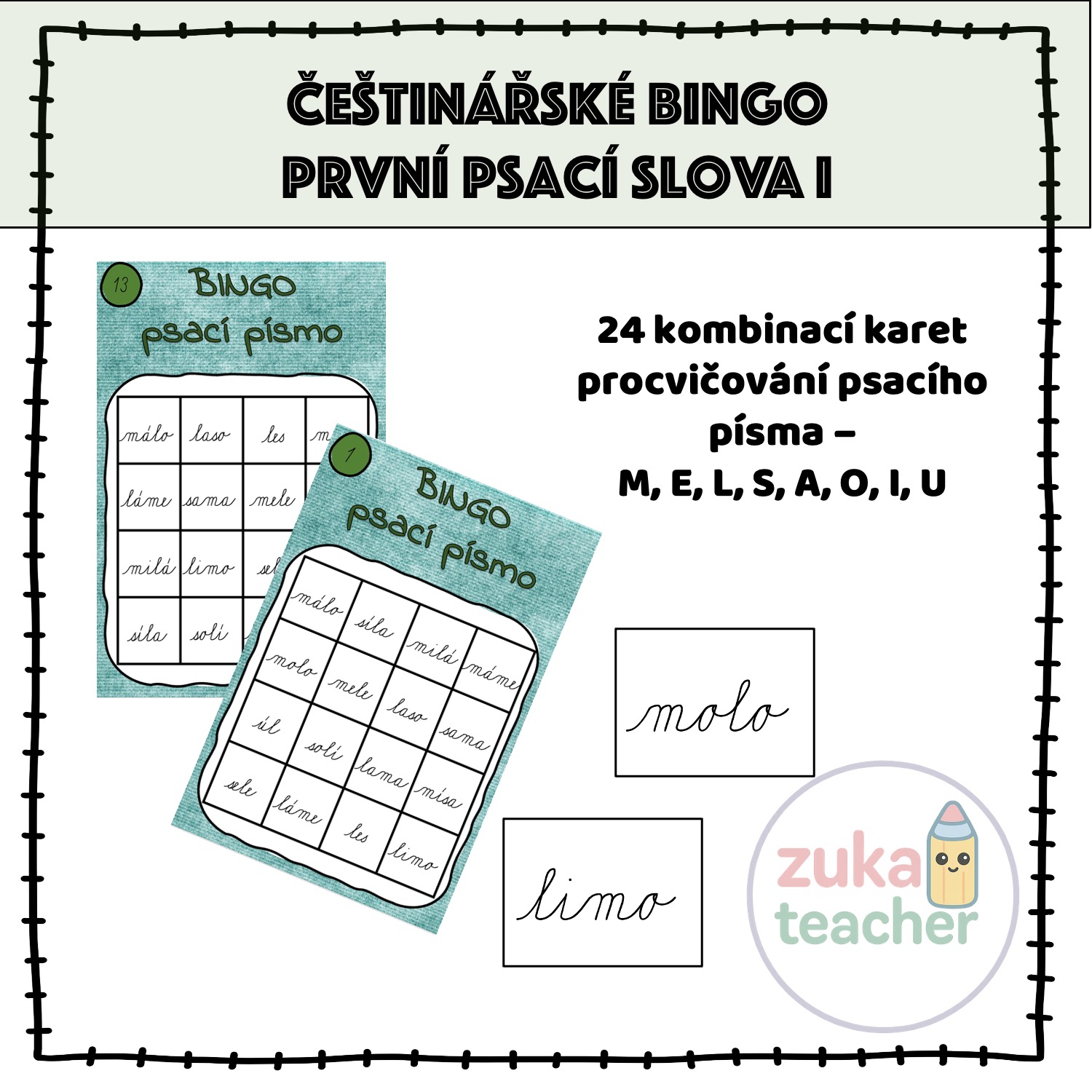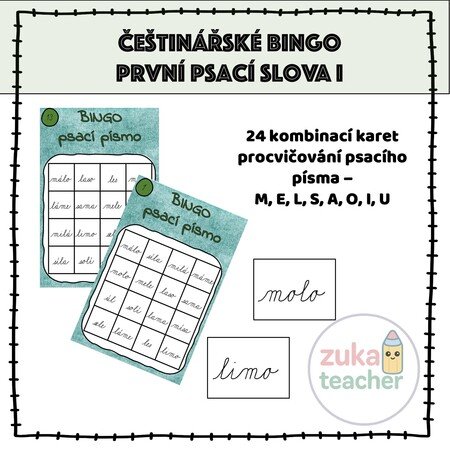 Materiál obsahuje 24 možných kombinací na kartách bingo. Slova jsou z písmen: A, E, I, O, U, M, L, S.