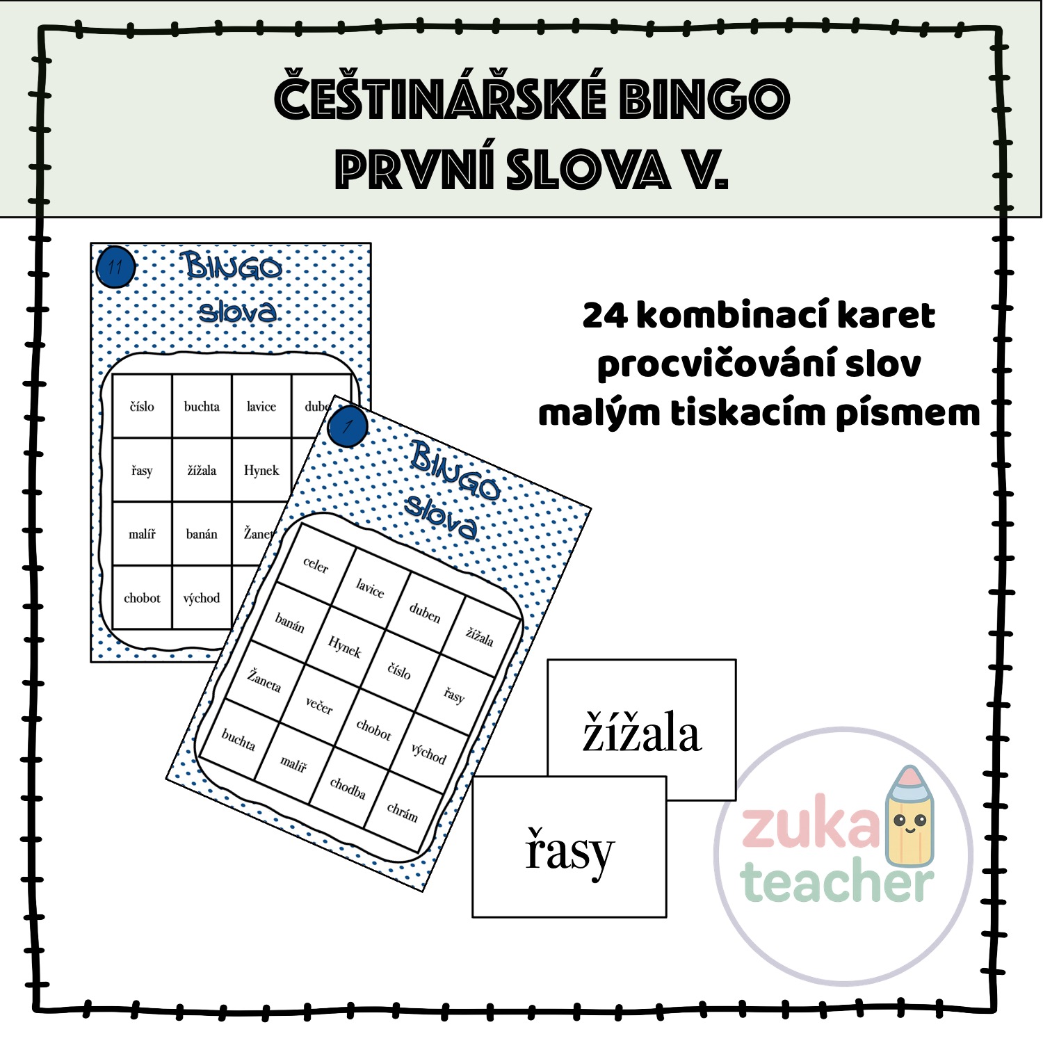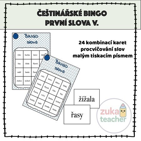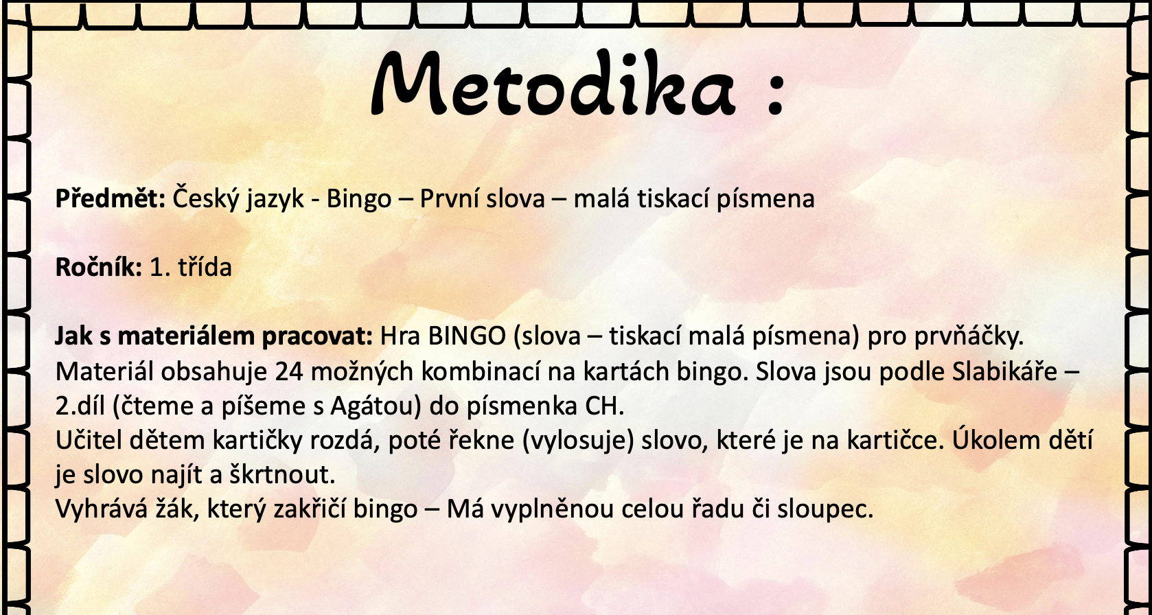 Materiál obsahuje 24 možných kombinací na kartách bingo. Slova jsou podle Slabikáře – 2.díl (čteme a píšeme s Agátou) do písmenka CH.