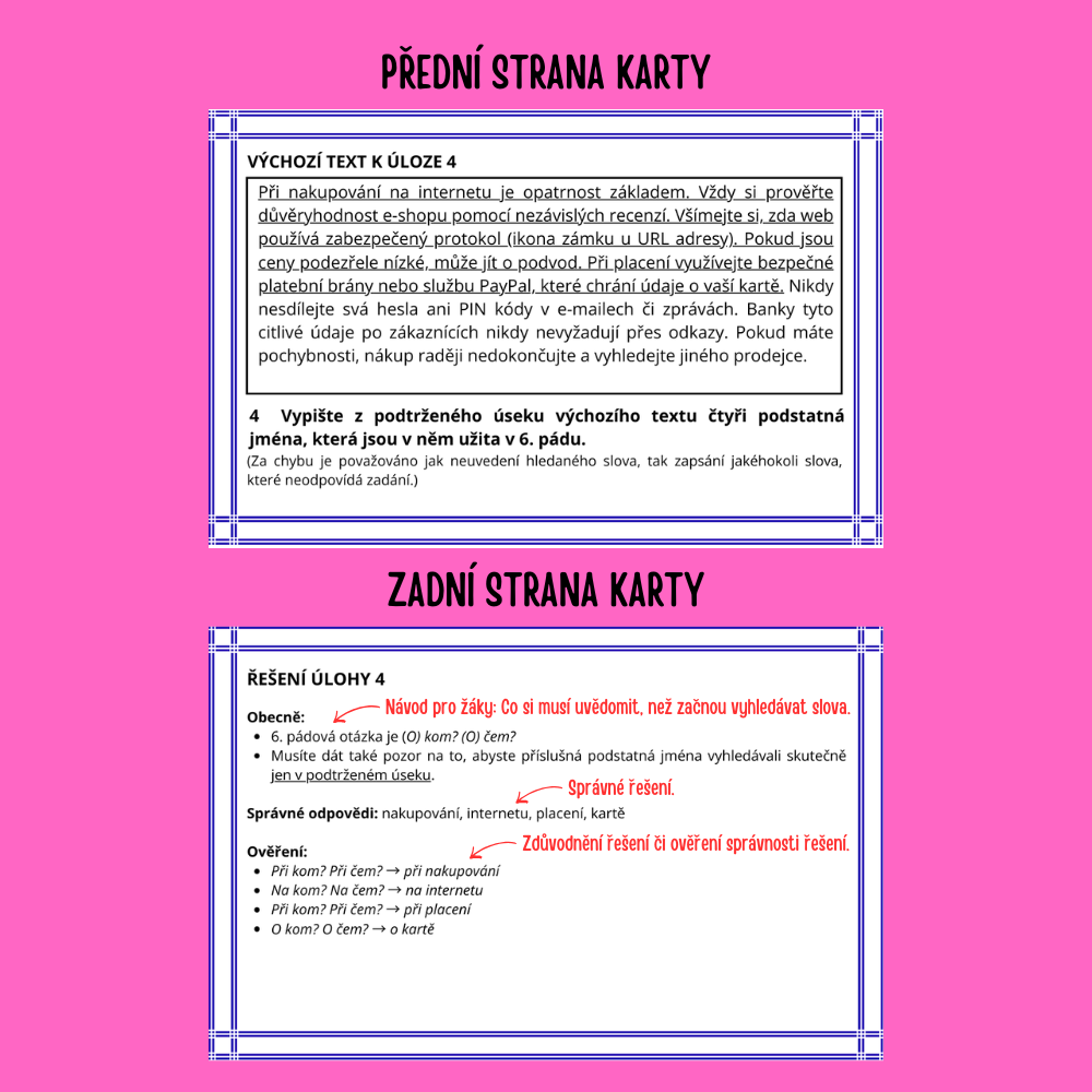 - Materiál je ideální pro samostatnou práci – díky zadním stranám karet si žáci mohou snadno ověřovat správnost svého řešení.