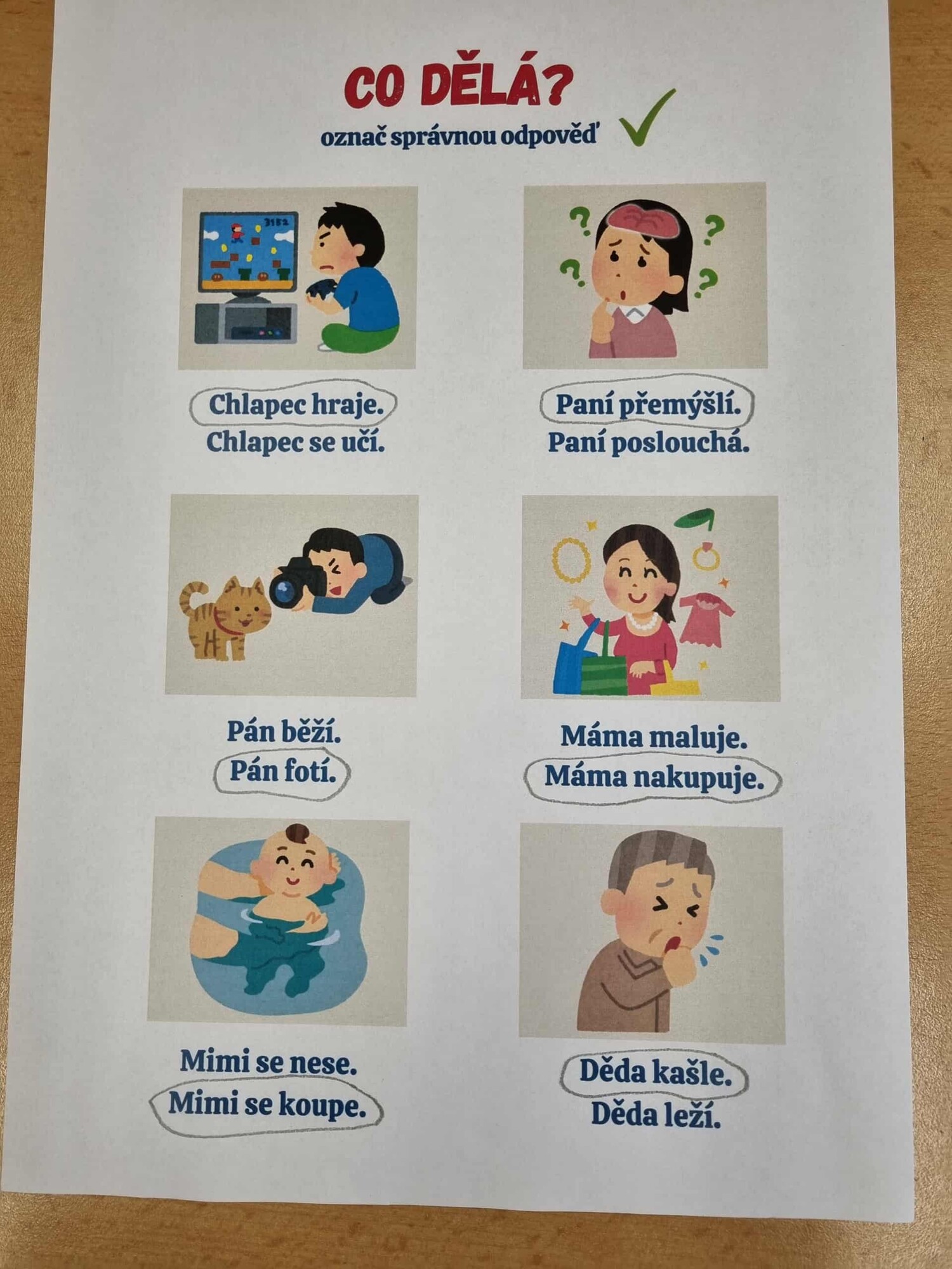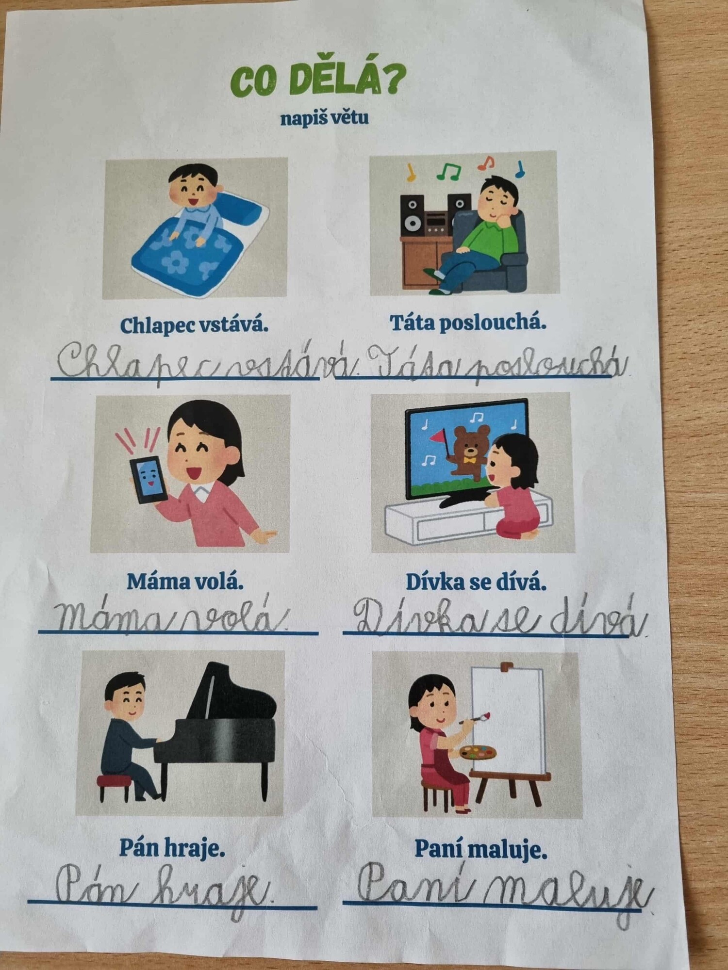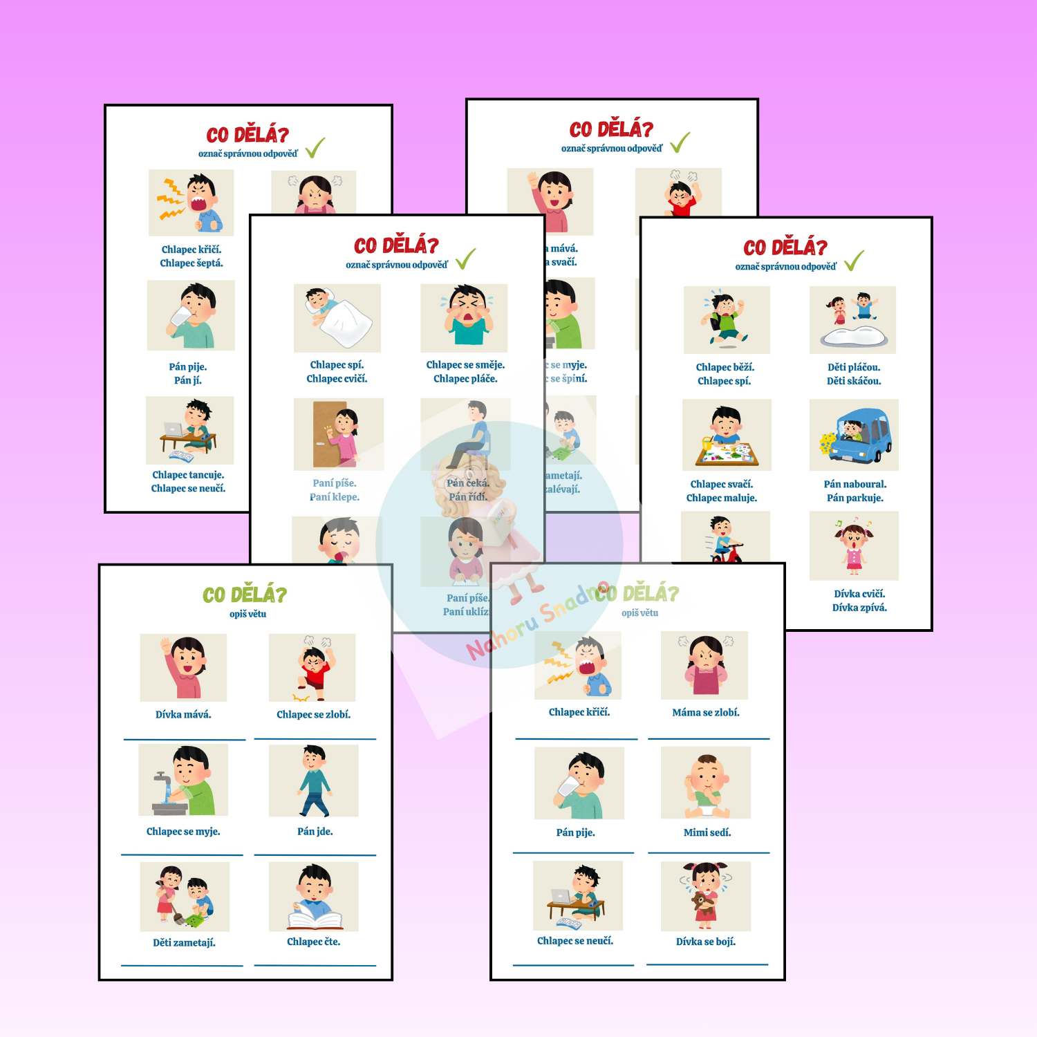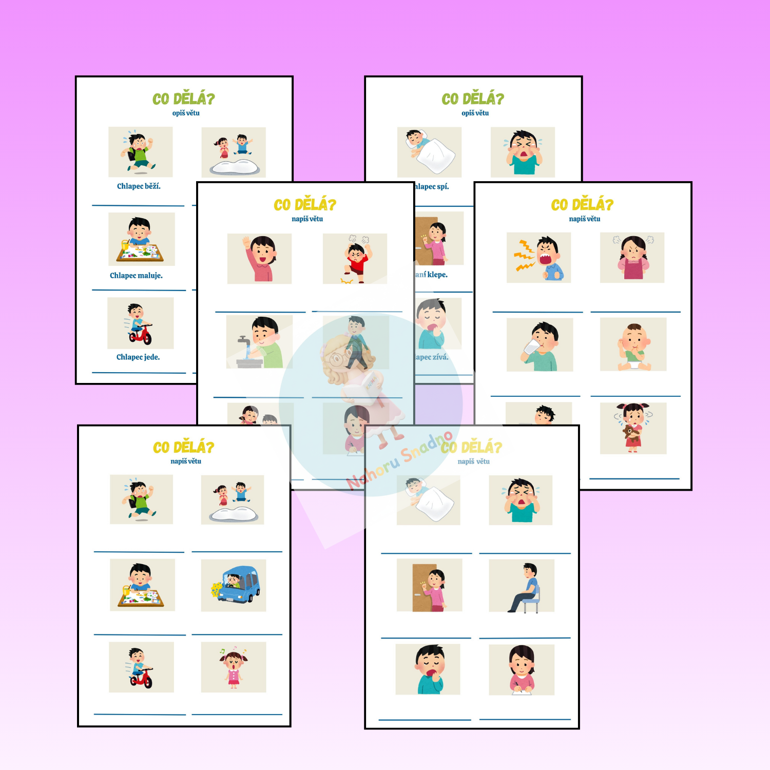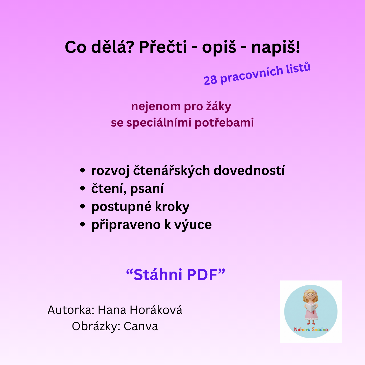 ráda vám představím pracovní soubor „Co dělá? Přečti - opiš - napiš!”, který jsem vytvořila pro vaše hodiny českého jazyka. Materiál je navržený tak, aby byl okamžitě použitelný – jednoduše jej vytisknete a můžete rovnou začít pracovat se žáky.