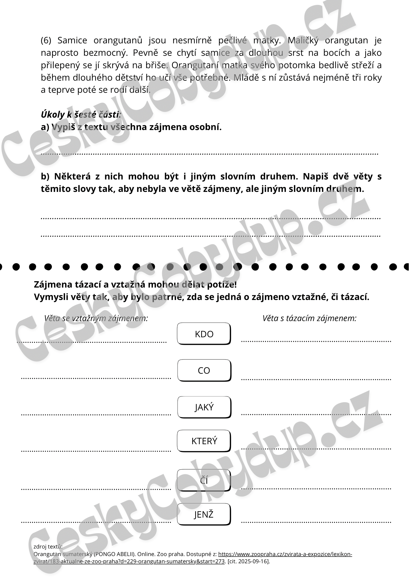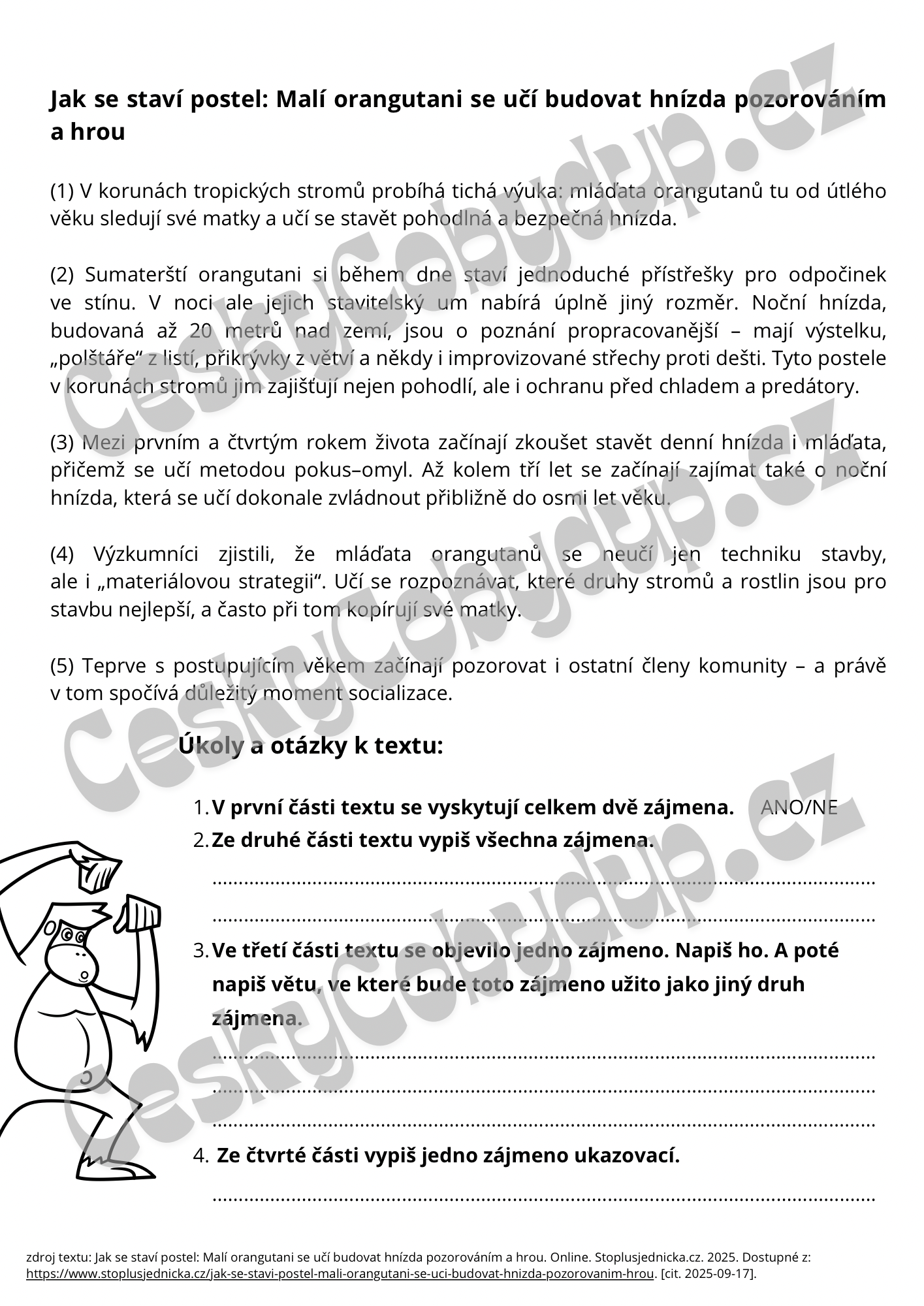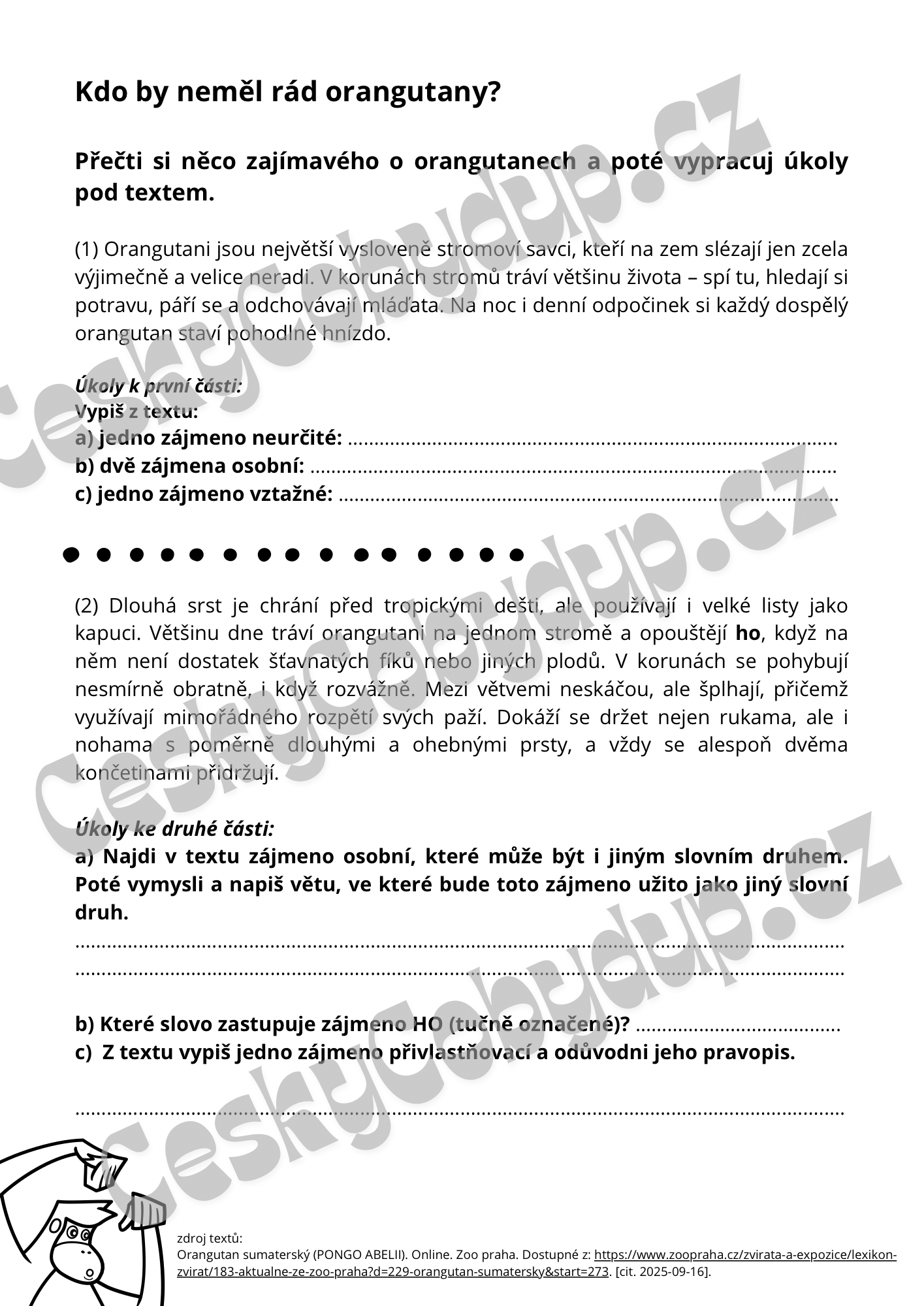Dále pak třetí, čtvrtý, pátý i šestý pracovní list obsahují texty o orangutanech, na kterých si žáci vyzkouší rozmanité úlohy týkající se zájmen. Budou vyhledávat zájmena v textu, určovat jejich druh, pád apod.