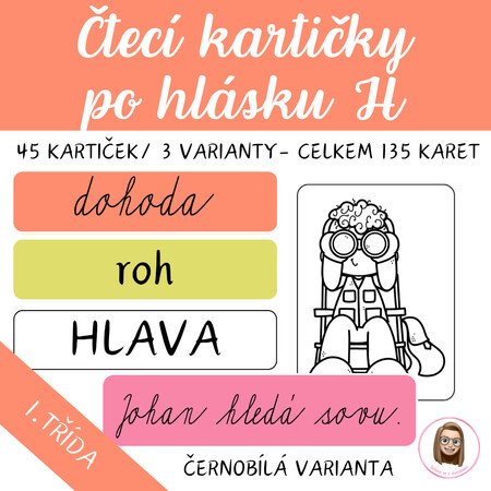 Čtecí kartičky po hlásku H, které dětem pomohou jistě a hravě zvládnout první čtenářské pokroky. Soubor obsahuje celkem 135 kartiček ve třech typech písma (velké tiskací, malé tiskací, psací) a k tomu šest vět s obrázky pro nácvik čtení s porozuměním. Nechybí ani pracovní listy k psaní s hláskou H a krátkých slov a vět.